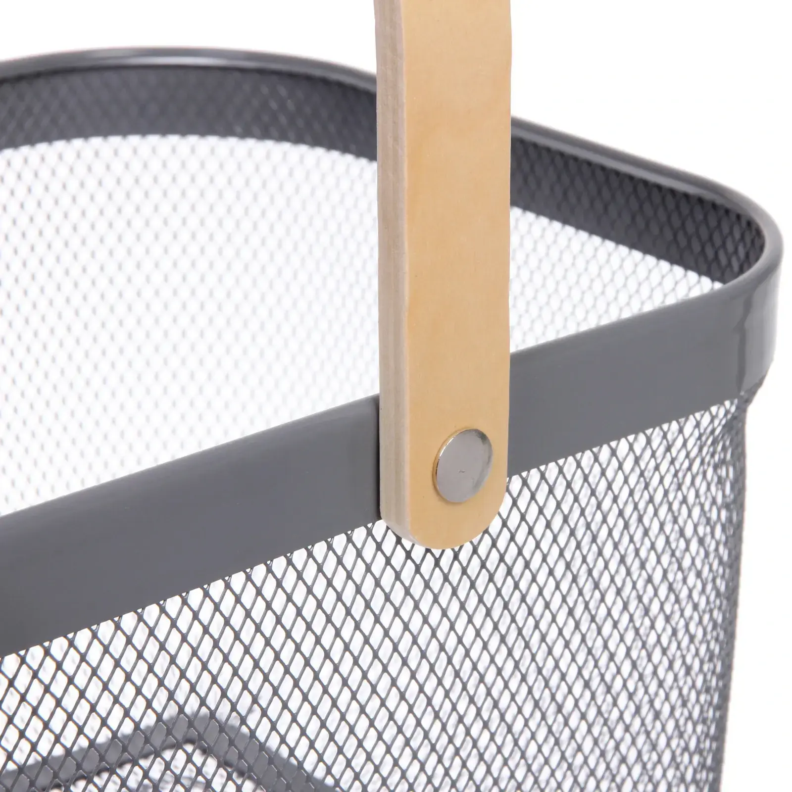 Эта корзина для хранения станет незаменимым помощником в вашем доме. Она сочетает в себе практичность и элегантный дизайн, что делает её идеальным решением для организации пространства. Серый цвет и деревянные ручки придают корзине современный вид, а металлическая сетка позволяет видеть содержимое, что упрощает поиск необходимых вещей.