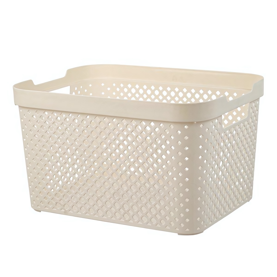 Прямоугольная форма помогает рационально использовать пространство полок. Встроенные ручки-вырезы по бокам облегчают переноску даже при полной загрузке. Перфорированные стенки с геометрическим узором обеспечивают лёгкость конструкции и придают модели аккуратный, современный вид.