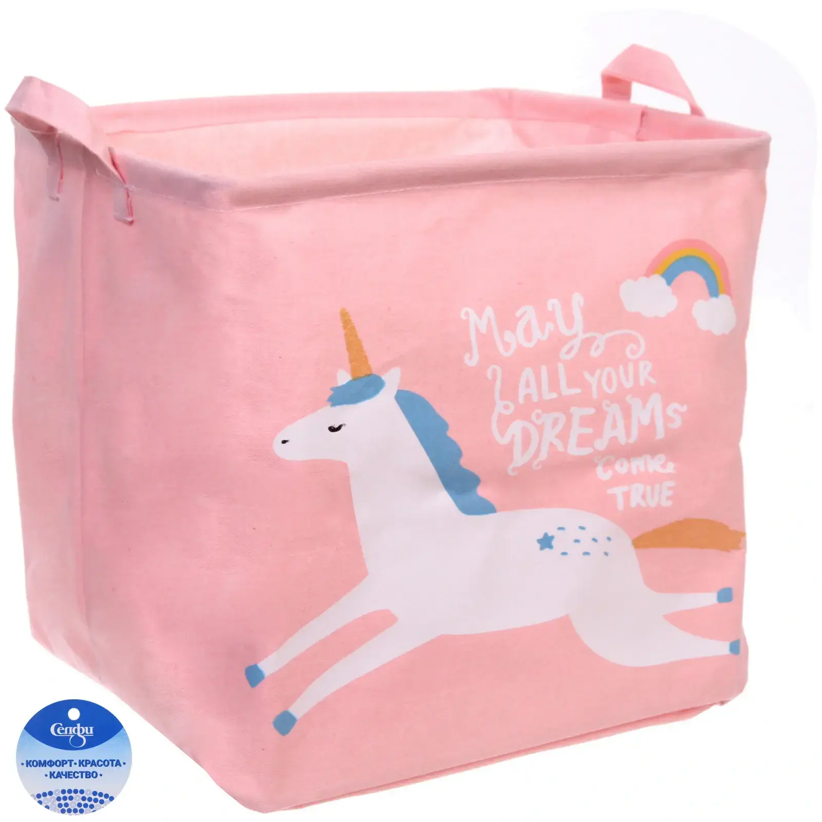 Корзина выполнена из качественного текстиля, что гарантирует её долговечность и устойчивость к износу. Размеры 33х33х33 см позволяют удобно размещать её в шкафах, на полках или в детской комнате. Принт единорога с радугой и облаками делает её привлекательной для детей, а также добавляет ярких красок в ваш интерьер.