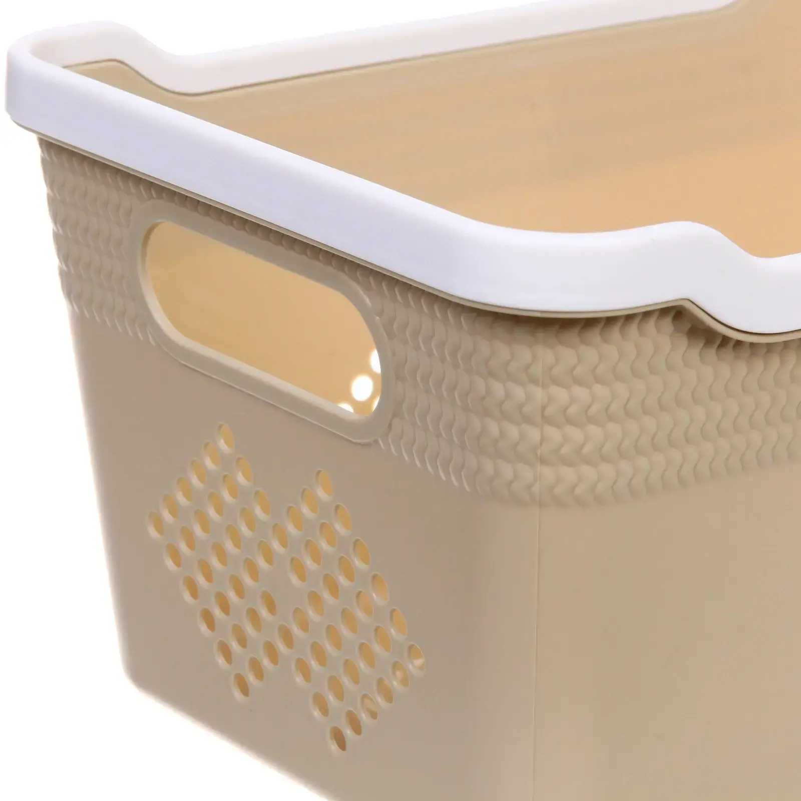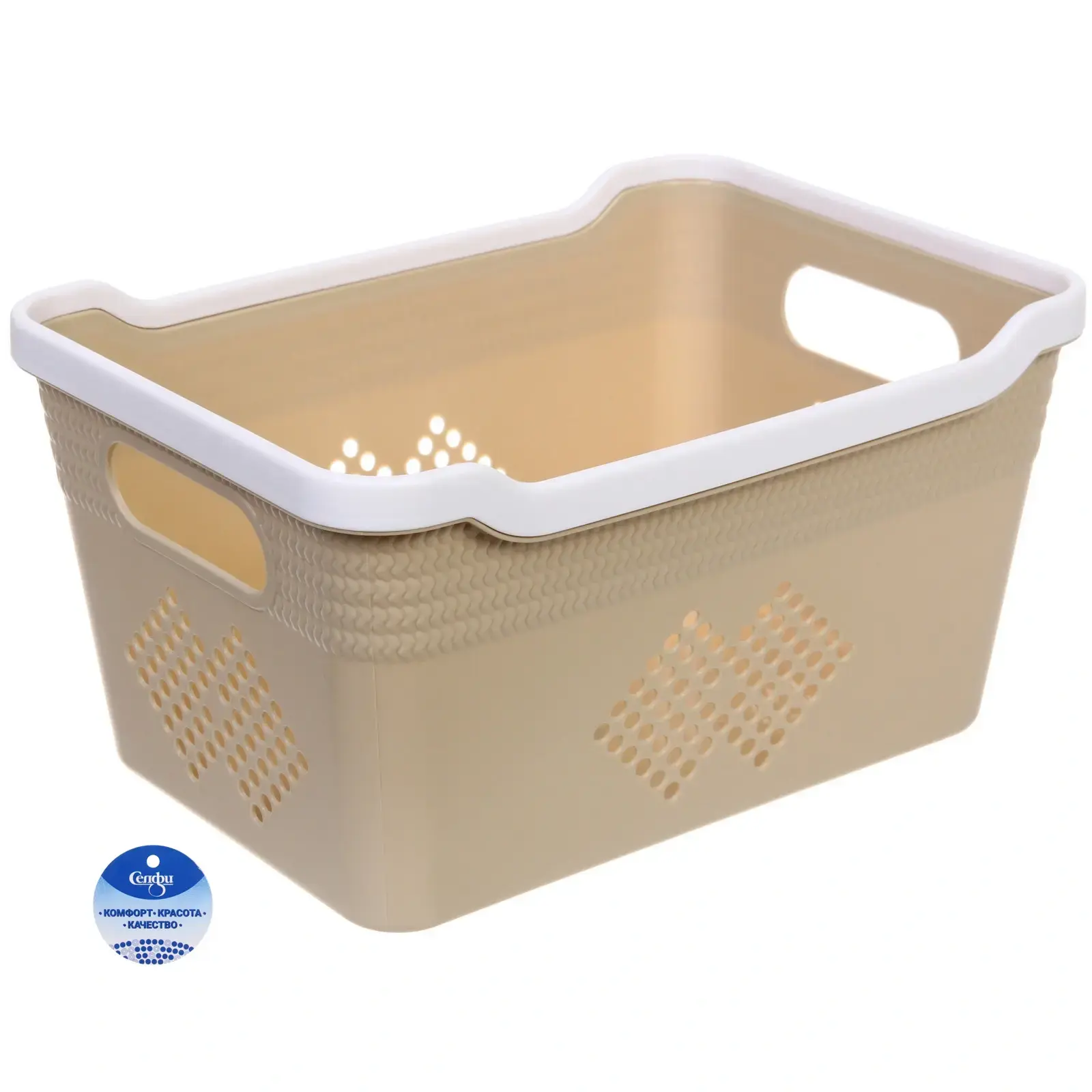 Корзина выполнена из качественного пластика, что обеспечивает её долговечность и легкость. Перфорированная структура боковых стенок обеспечивает вентиляцию, что позволяет хранить в ней даже текстильные изделия, не опасаясь появления неприятных запахов. Бежевый цвет с белой окантовкой придаёт корзине стильный вид, который легко впишется в любой интерьер.