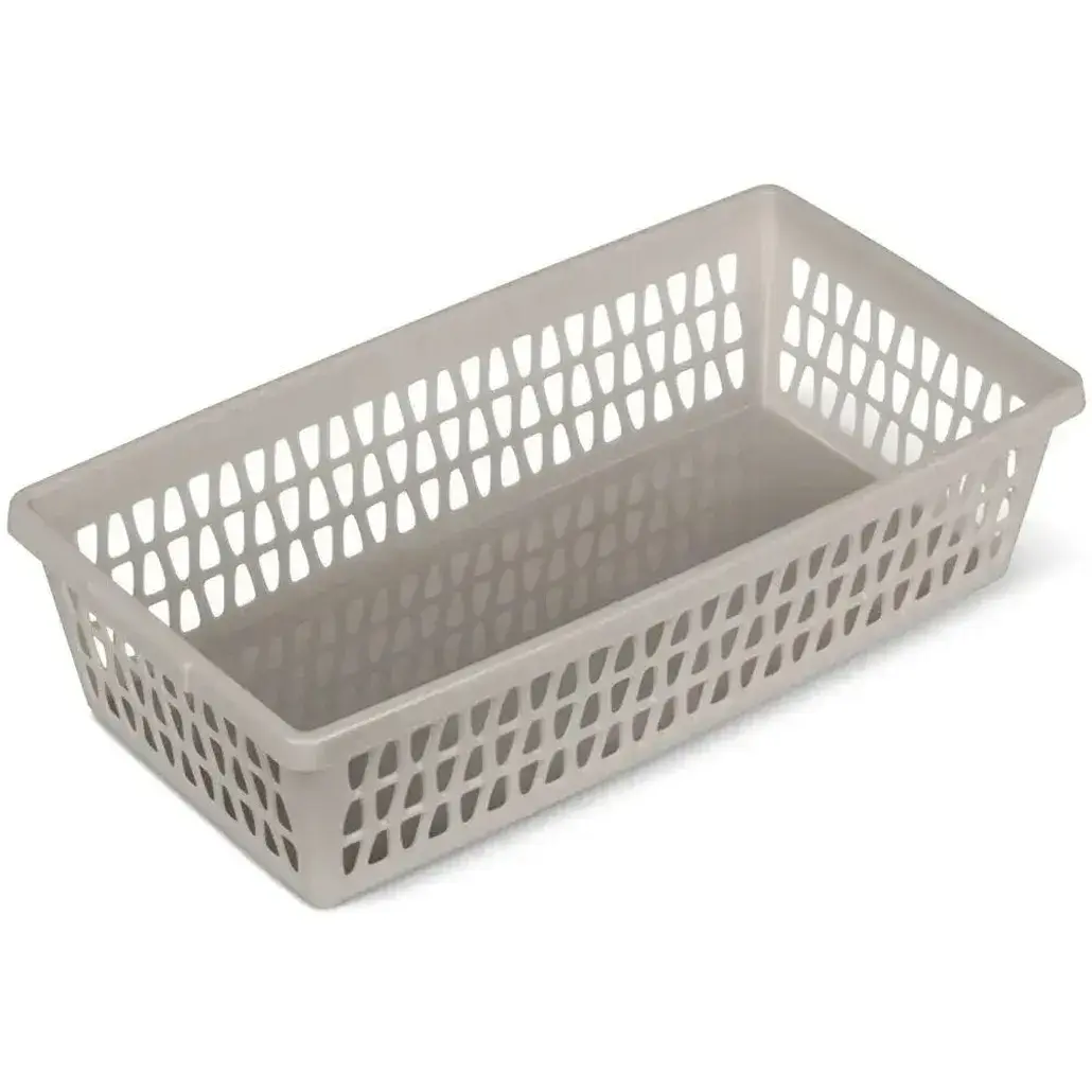 Изготовлена из экологичного полипропилена серо-коричневого оттенка. Прямоугольная форма с перфорированными стенками упрощает поиск содержимого. Вес менее 300 г позволяет легко переносить корзину с места на место.
