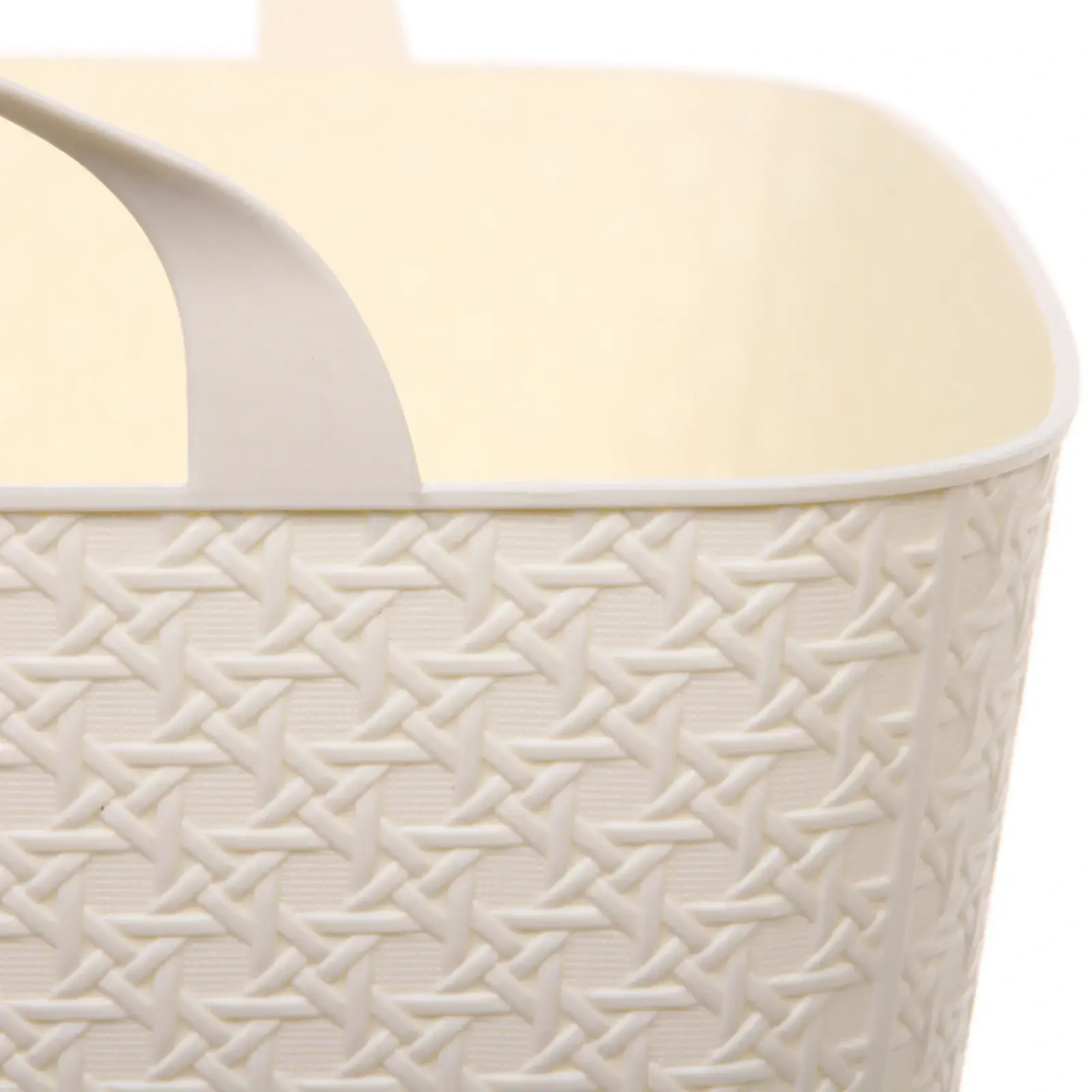 Корзина выполнена из прочного пластика, что обеспечивает ее долговечность и легкость. Текстурированная поверхность с узором, напоминающим плетение, не только добавляет эстетическую привлекательность, но и предотвращает скольжение. Размеры 35.5х35.5х35.5 см делают ее вместительной, а гладкая внутренняя поверхность облегчает уход за ней.