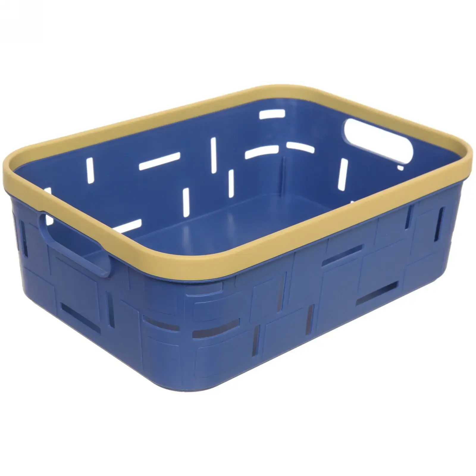 Корзина выполнена из прочного пластика, что обеспечивает долговечность и надежность. Отверстия в стенках способствуют хорошей вентиляции, предотвращая накопление пыли и влаги. Синяя расцветка с желтым ободком придаст вашему пространству свежий и современный вид.
