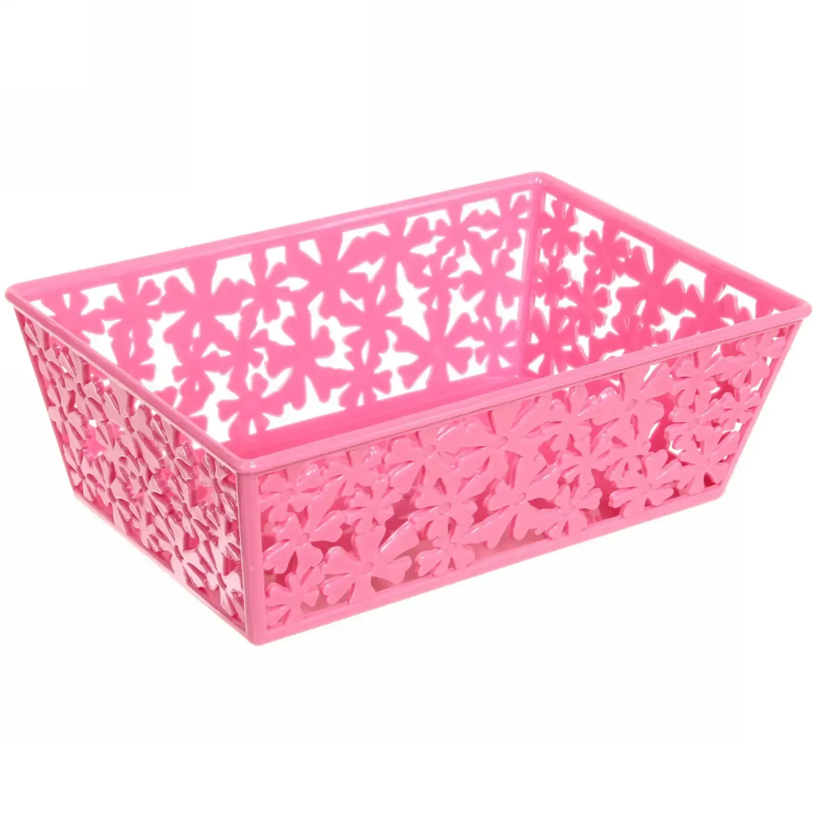 Корзина выполнена из прочного и легкого пластика, что делает ее идеальной для повседневного использования. Прозрачные стенки с цветочными вырезами не только добавляют эстетики, но и позволяют видеть содержимое, что упрощает поиск нужных вещей. Она отлично подходит для хранения игрушек, косметики, канцелярских принадлежностей и других мелочей, которые часто теряются в доме.