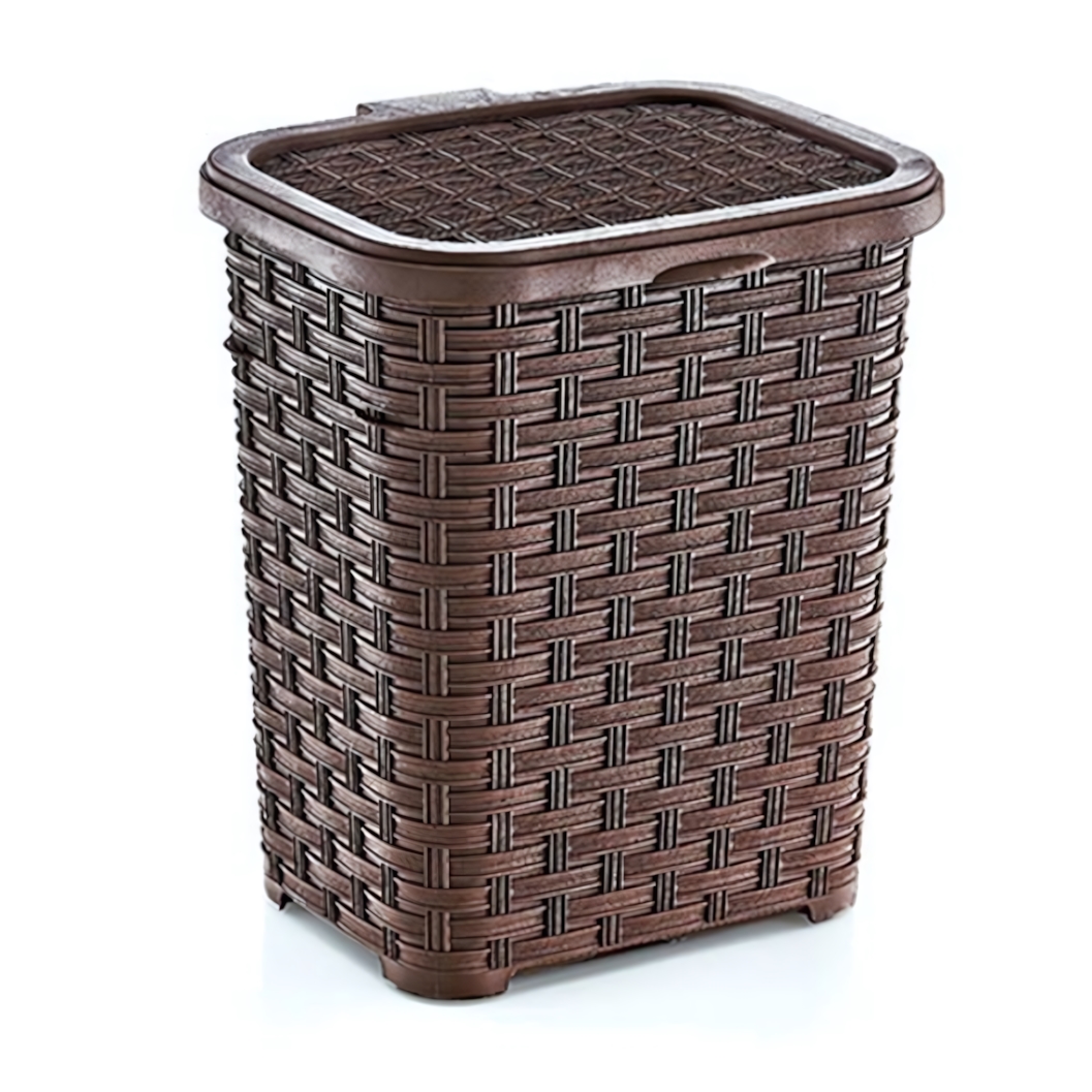 Корпус выполнен из прочного пластика с декоративной текстурой под плетение. Материал не впитывает запахи, легко очищается и подходит для регулярного использования в помещениях с повышенной влажностью. Закрытая форма помогает поддерживать порядок и визуальную чистоту пространства, скрывая бытовые принадлежности от глаз.
