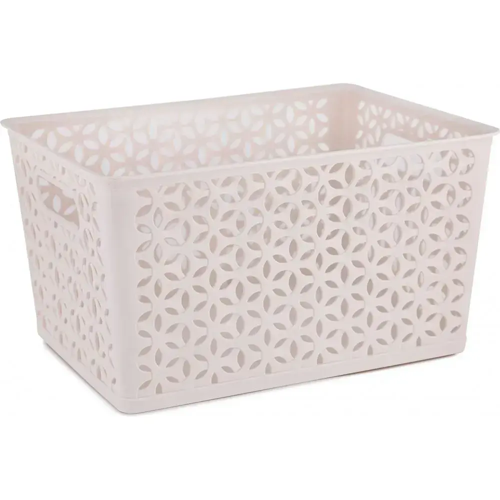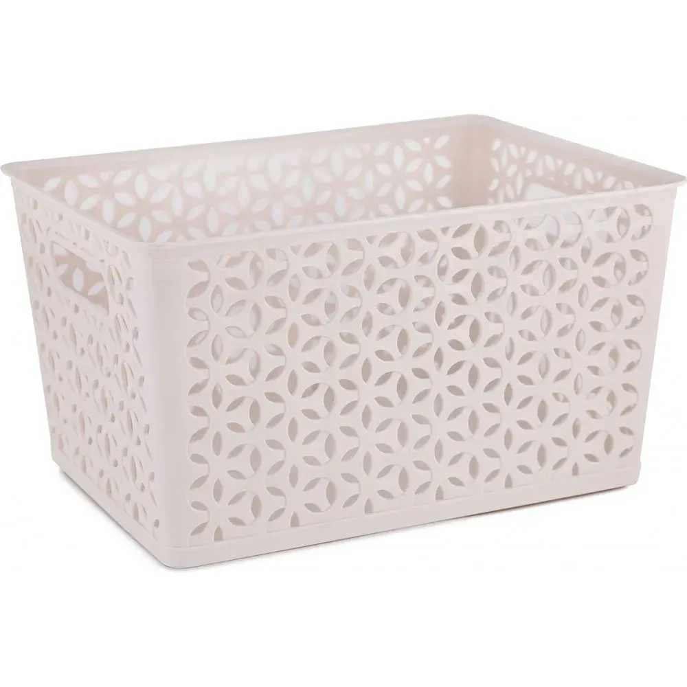 Прочный пластик с геометрическим узором устойчив к деформации и прост в уходе. Закругленные края и гладкая поверхность защищают вещи от повреждений. Единый размер 380х210мм позволяет составлять корзины в штабели для экономии места.