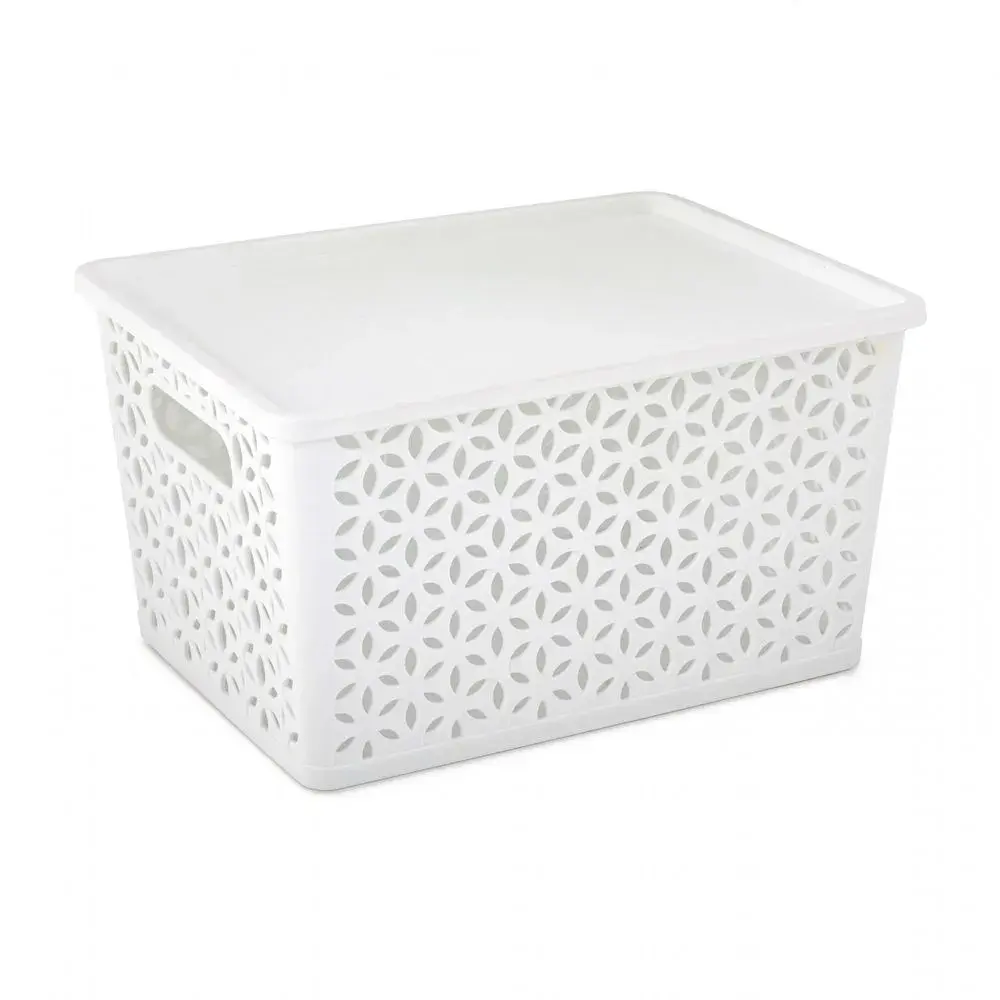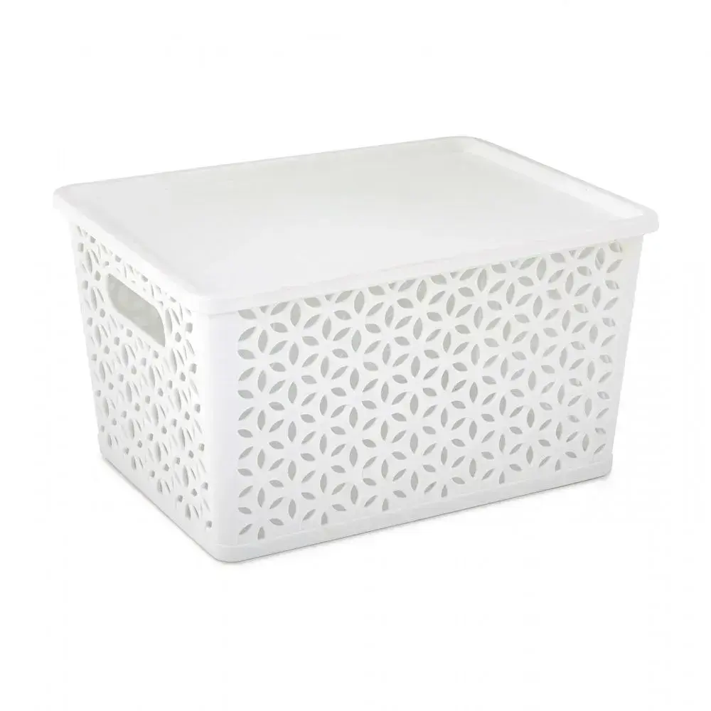 Штабелируйте корзины в шкафу или расставьте на открытых полках. Плотно закрывающиеся крышки защитят содержимое от пыли, а перфорация обеспечит циркуляцию воздуха. Подходит для хранения в жилых и подсобных помещениях.