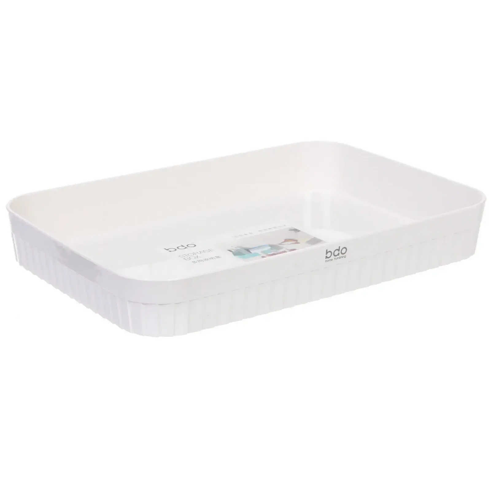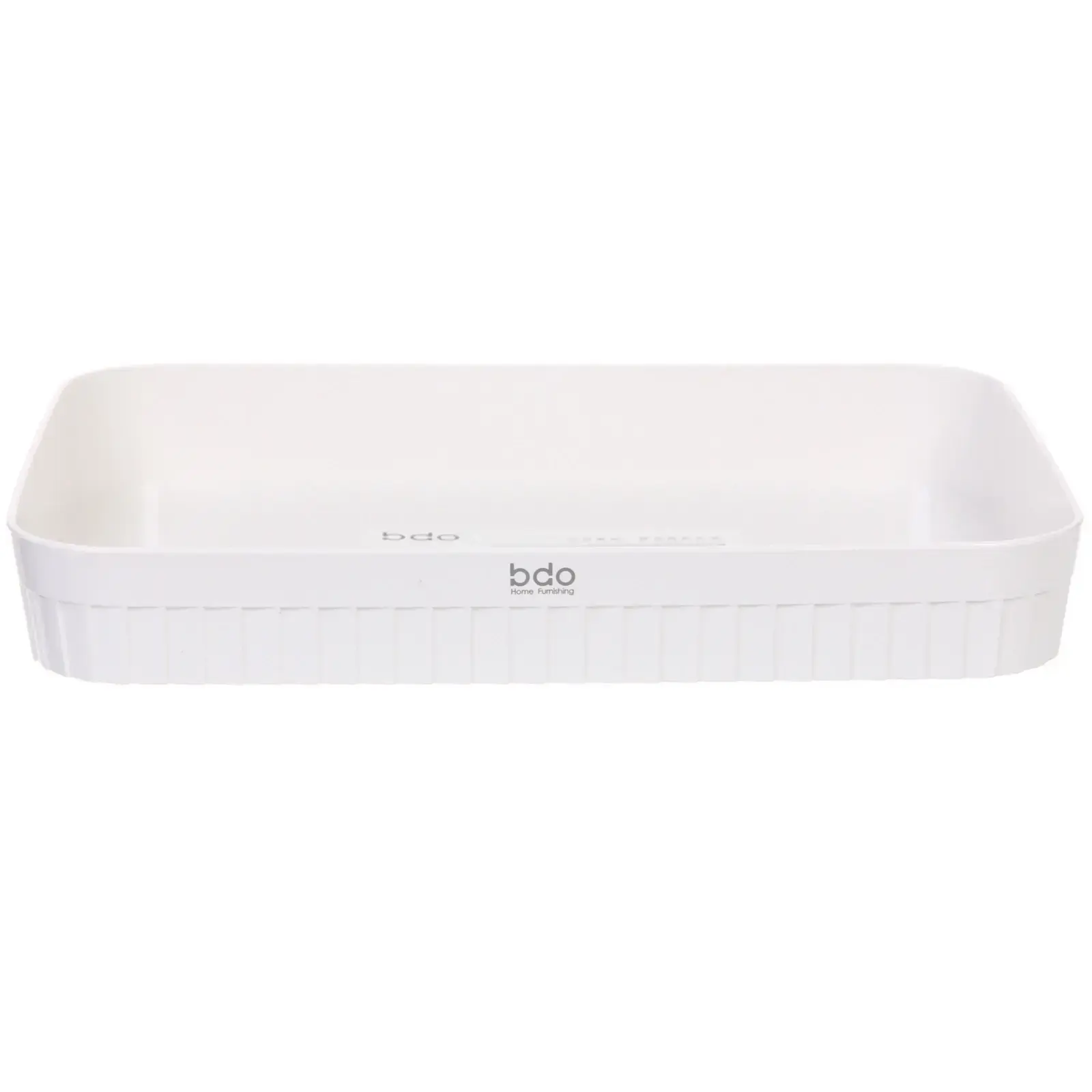 Прямоугольная форма с закруглёнными углами (33.5×23×4.5 см) оптимальна для размещения на полках и в нишах. Высокие бортики предотвращают выпадение содержимого, а гладкая внутренняя поверхность упрощает очистку. Устойчивый пластик выдерживает нагрузку до 5 кг без деформации.