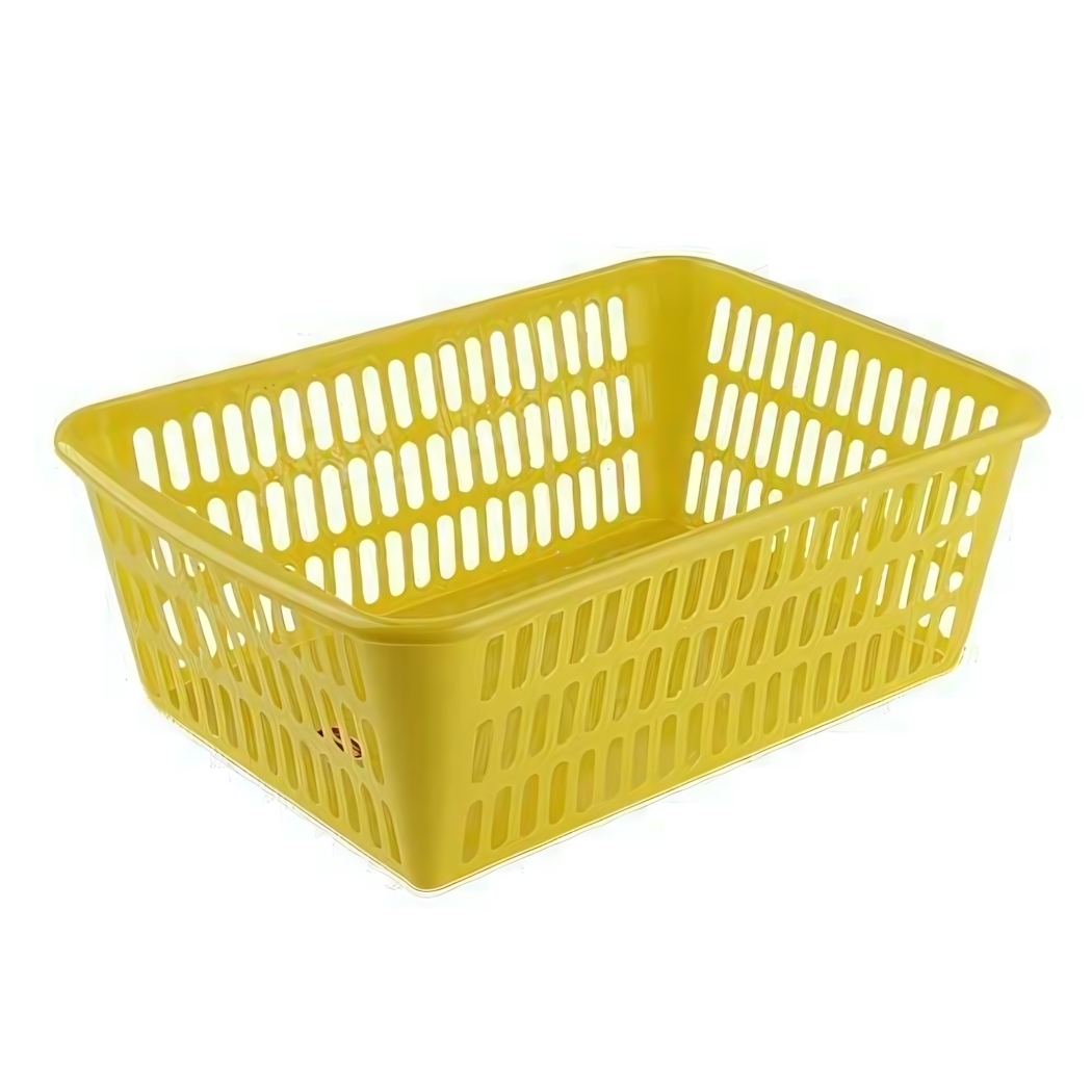 Корзина имеет прямоугольную форму и открытые отверстия по бокам, что обеспечивает отличную вентиляцию и легкий доступ к содержимому. Она идеально подходит для использования в домашних условиях, а также для транспортировки покупок. Благодаря своему простому дизайну, корзина легко впишется в любой интерьер, добавляя яркий акцент в ваше пространство.