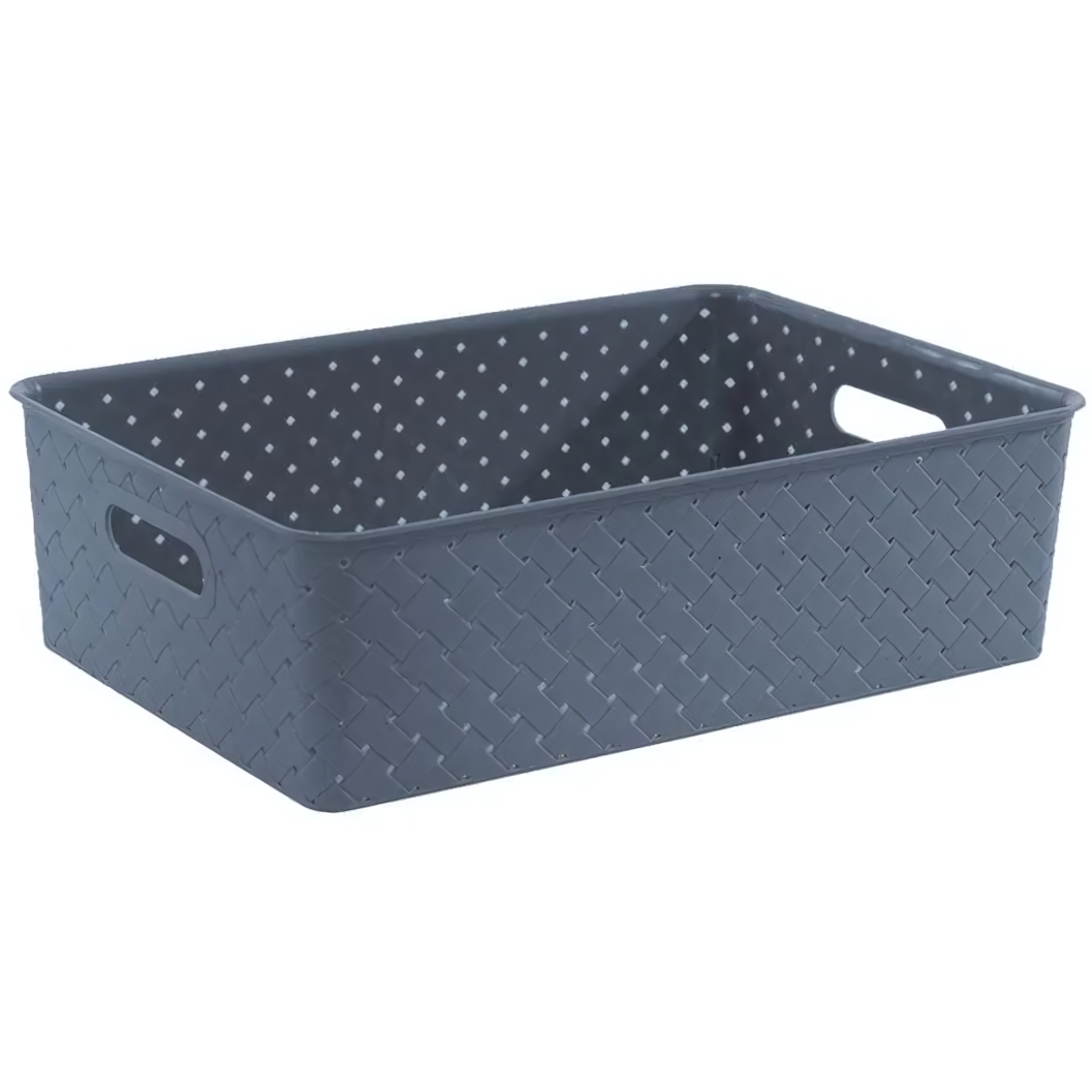 Прямоугольная форма со скругленными углами позволяет компактно размещать корзинку на полке, в шкафу или на стеллаже. Перфорированные стенки обеспечивают циркуляцию воздуха, что особенно удобно для хранения текстиля, аксессуаров и других бытовых мелочей. Вырезы по бокам выполняют функцию ручек — корзинку легко доставать даже с верхних полок.