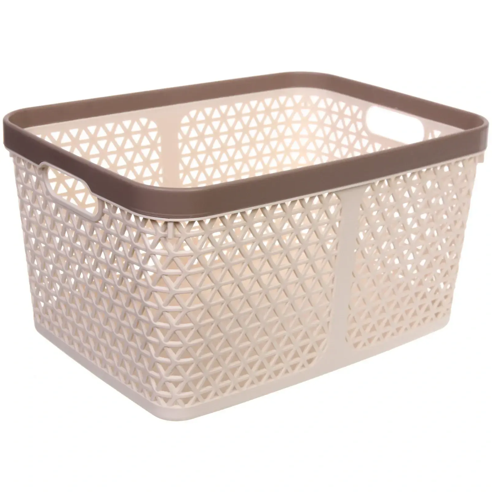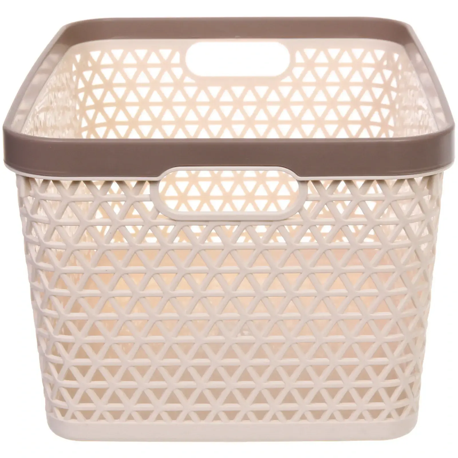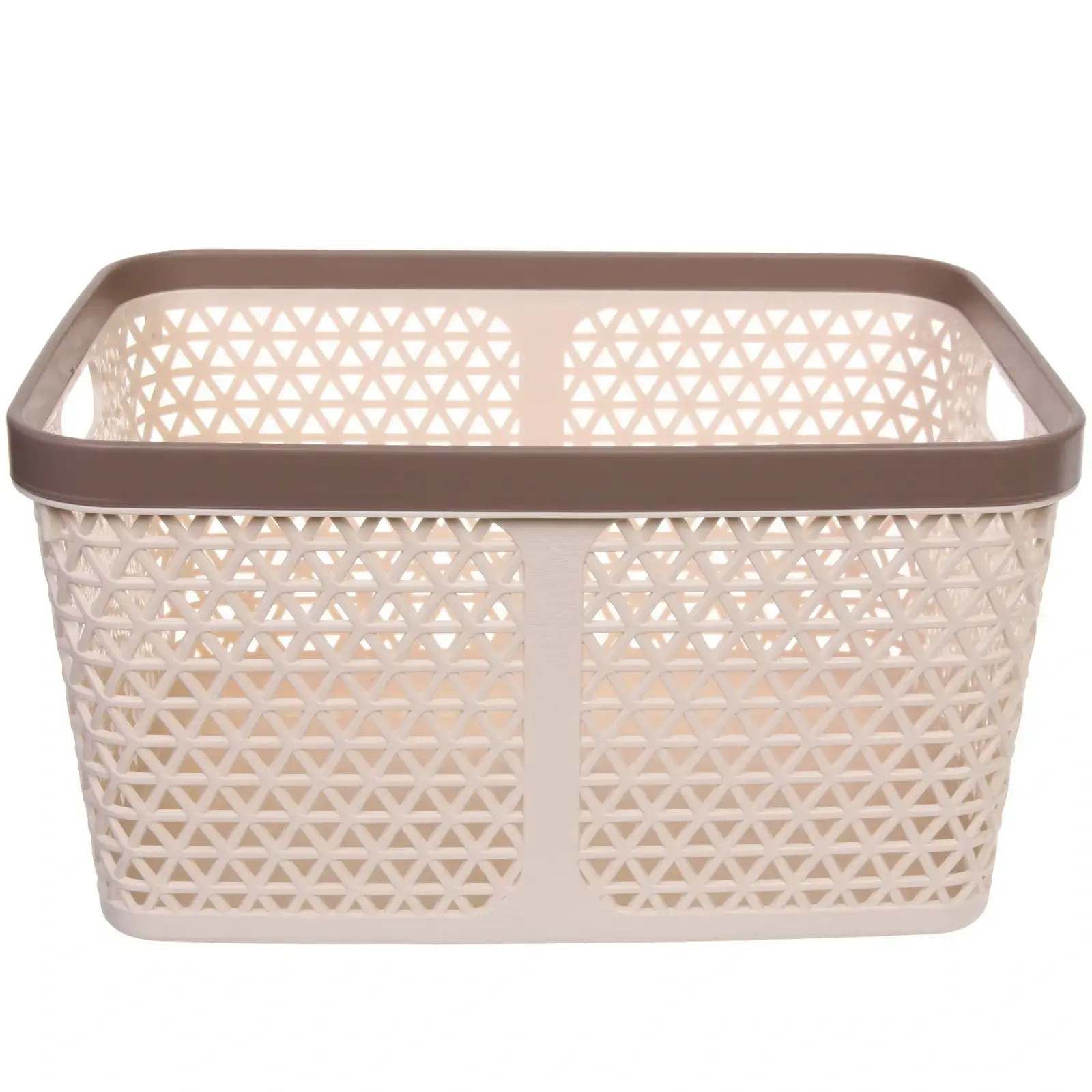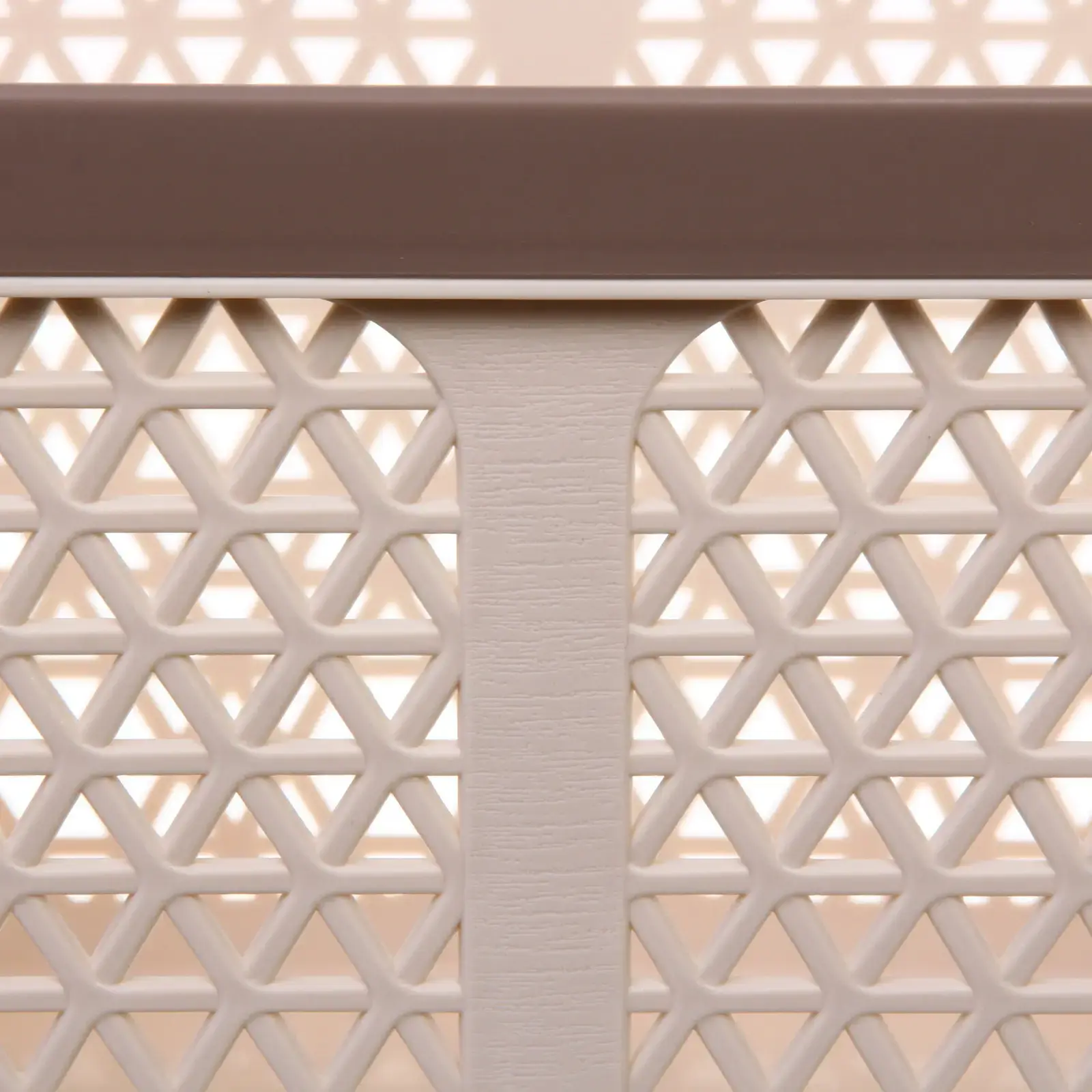 Корзинка выполнена из прочного пластика, что гарантирует её долговечность и устойчивость к повреждениям. Перфорированный дизайн не только добавляет эстетическую привлекательность, но и обеспечивает хорошую циркуляцию воздуха, что особенно важно для хранения текстильных изделий. Светлый цвет и геометрический узор делают корзину универсальным элементом декора, который легко сочетать с другими предметами интерьера.