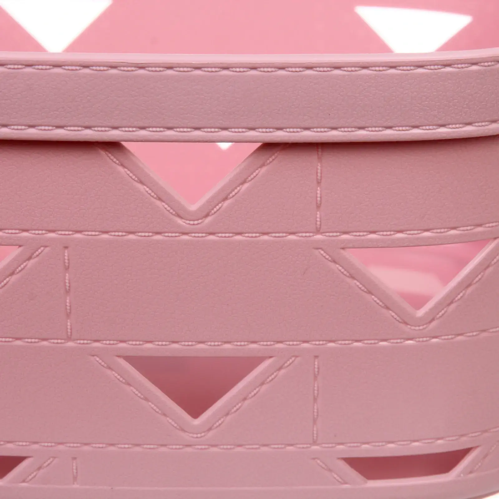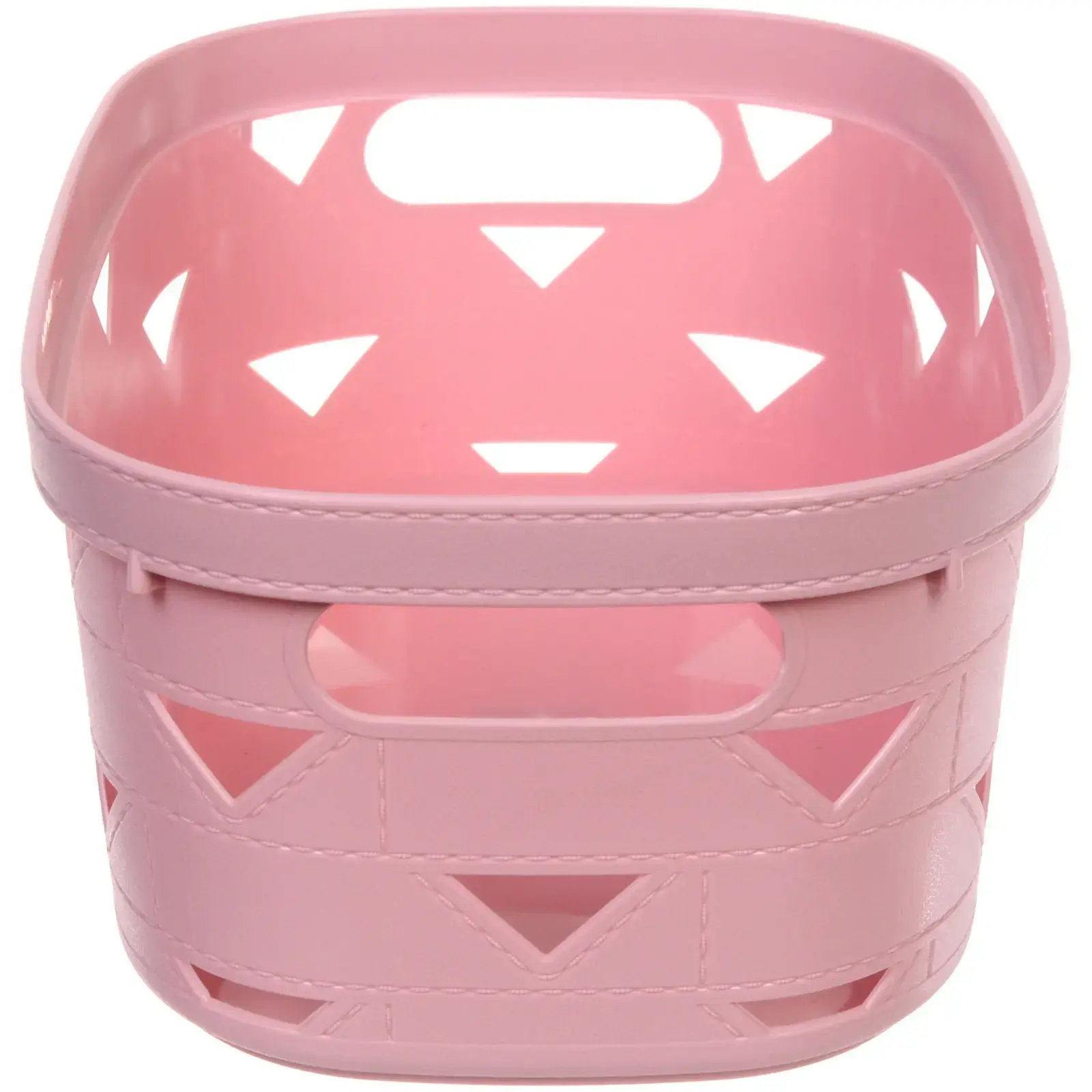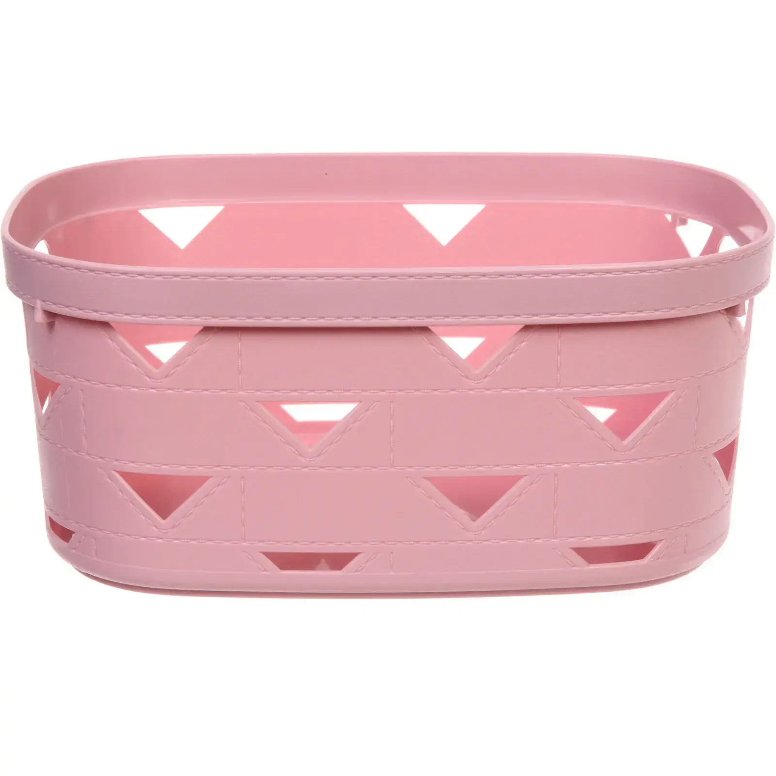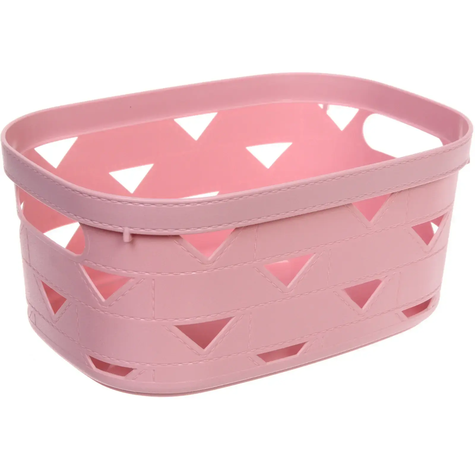 Корзинка выполнена из прочного пластика, что гарантирует долговечность и надежность в использовании. Декоративные вырезы в форме треугольников не только добавляют эстетики, но и обеспечивают вентиляцию, что особенно важно для хранения текстильных изделий. Пудровый розовый цвет придаст вашему пространству уют и стиль.