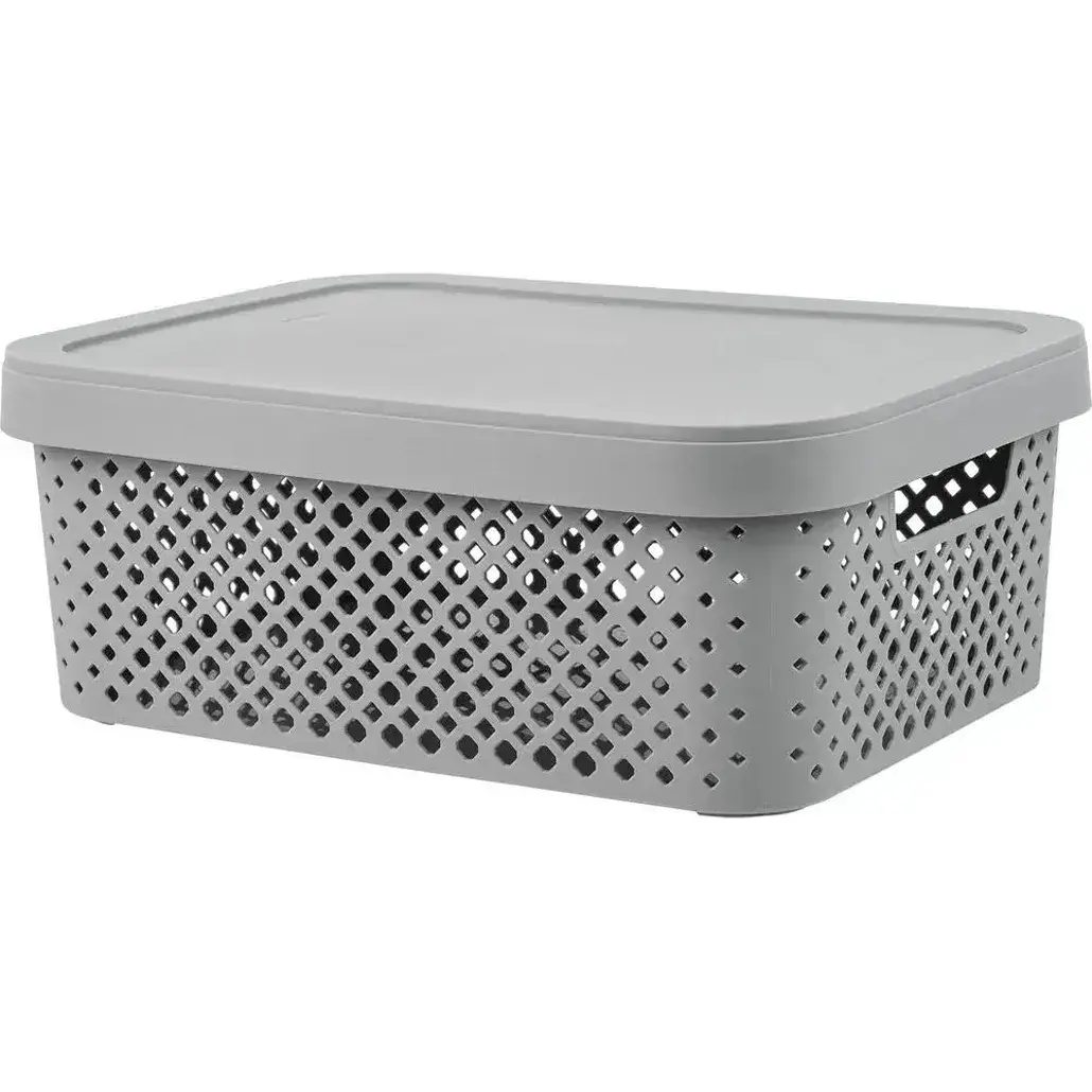 Благодаря прямоугольной форме с закругленными углами корзина компактно размещается в шкафах, на полках или под кроватью. Плоская крышка позволяет ставить сверху другие предметы, экономя пространство. Решётчатая структура основания обеспечивает циркуляцию воздуха, предотвращая образование запахов.