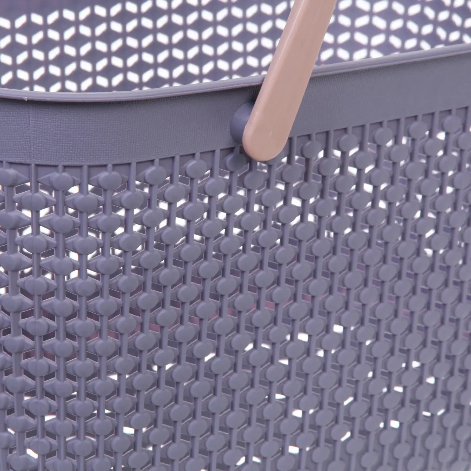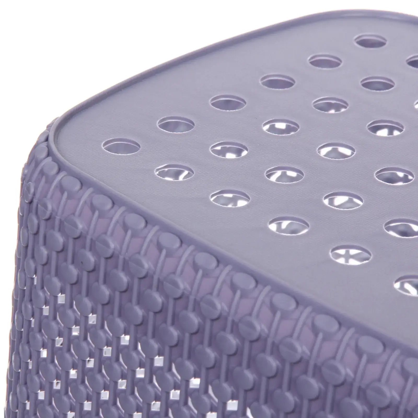 Корзинка выполнена из прочного пластика, что обеспечивает её долговечность и легкость в уходе. Сетчатая структура позволяет воздуху циркулировать, предотвращая накопление влаги и неприятных запахов. Темно-сиреневый цвет добавляет изюминку в интерьер, а универсальный дизайн позволяет использовать её в любых помещениях.