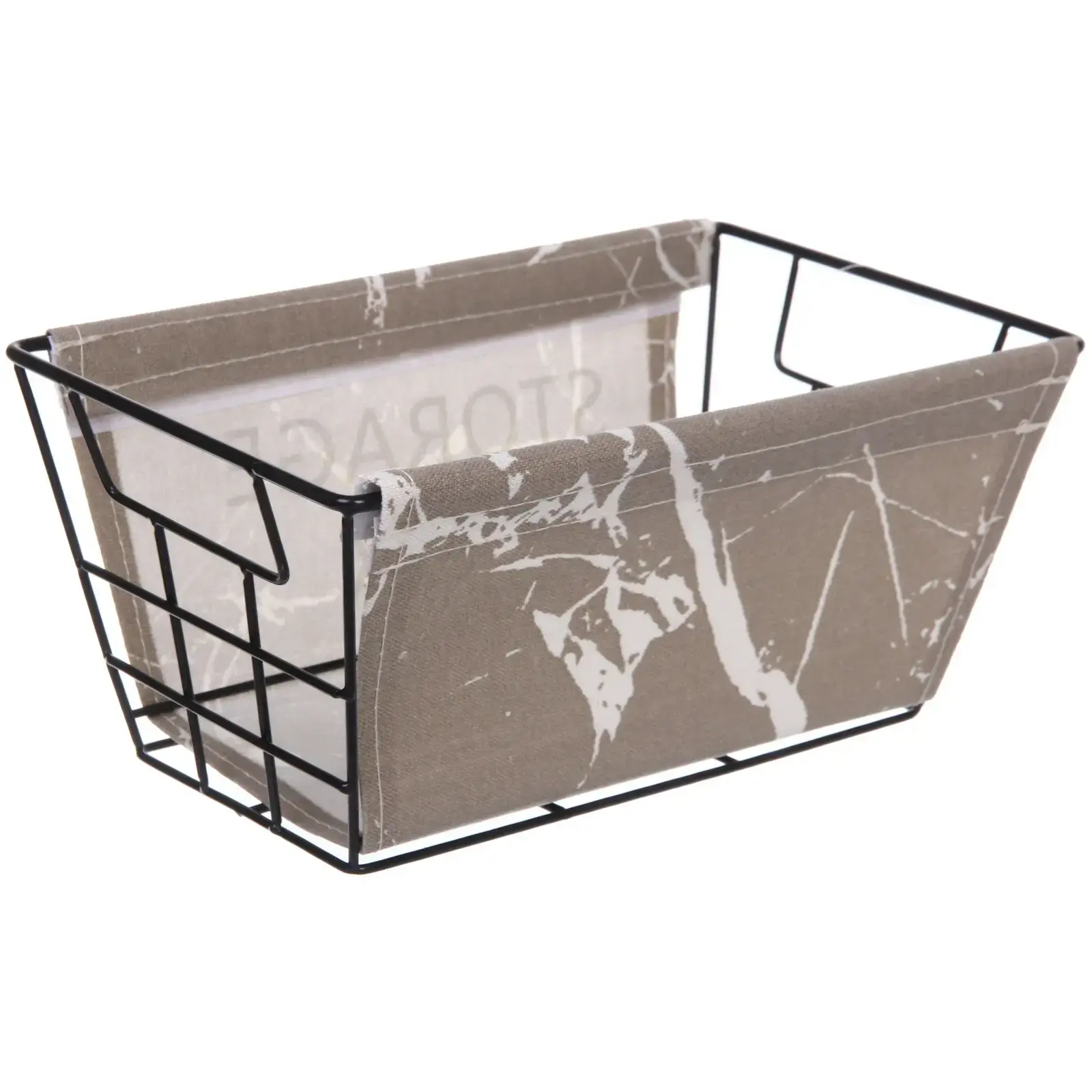 Корзинка изготовлена из прочного металла и текстиля, что обеспечивает долговечность и надежность. Металлическая решетчатая структура позволяет воздуху циркулировать, предотвращая накопление влаги и неприятных запахов. Тканевая вставка с мраморным узором добавляет эстетическую привлекательность и делает корзинку стильным элементом декора.