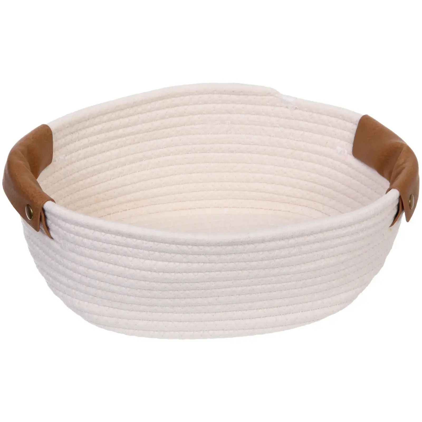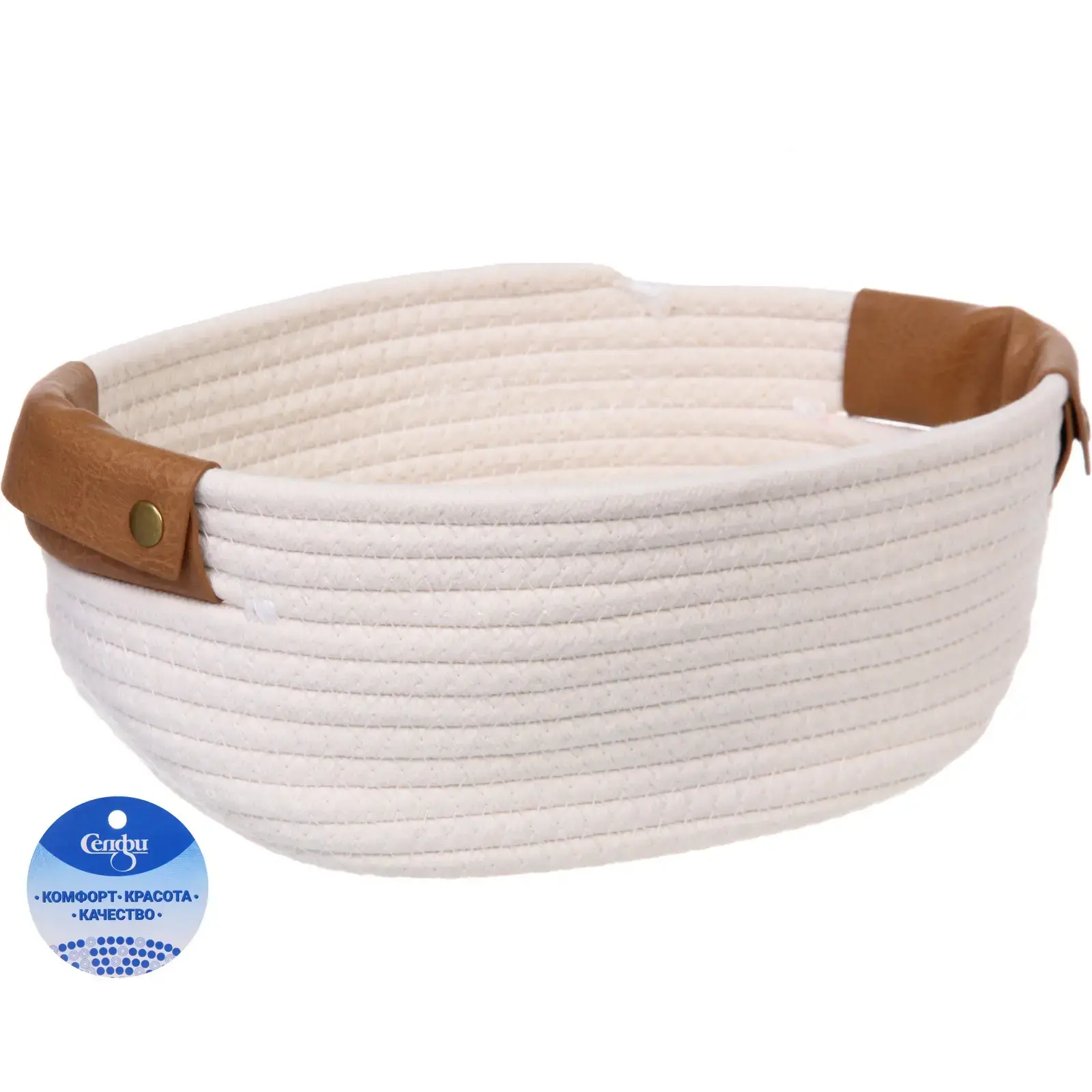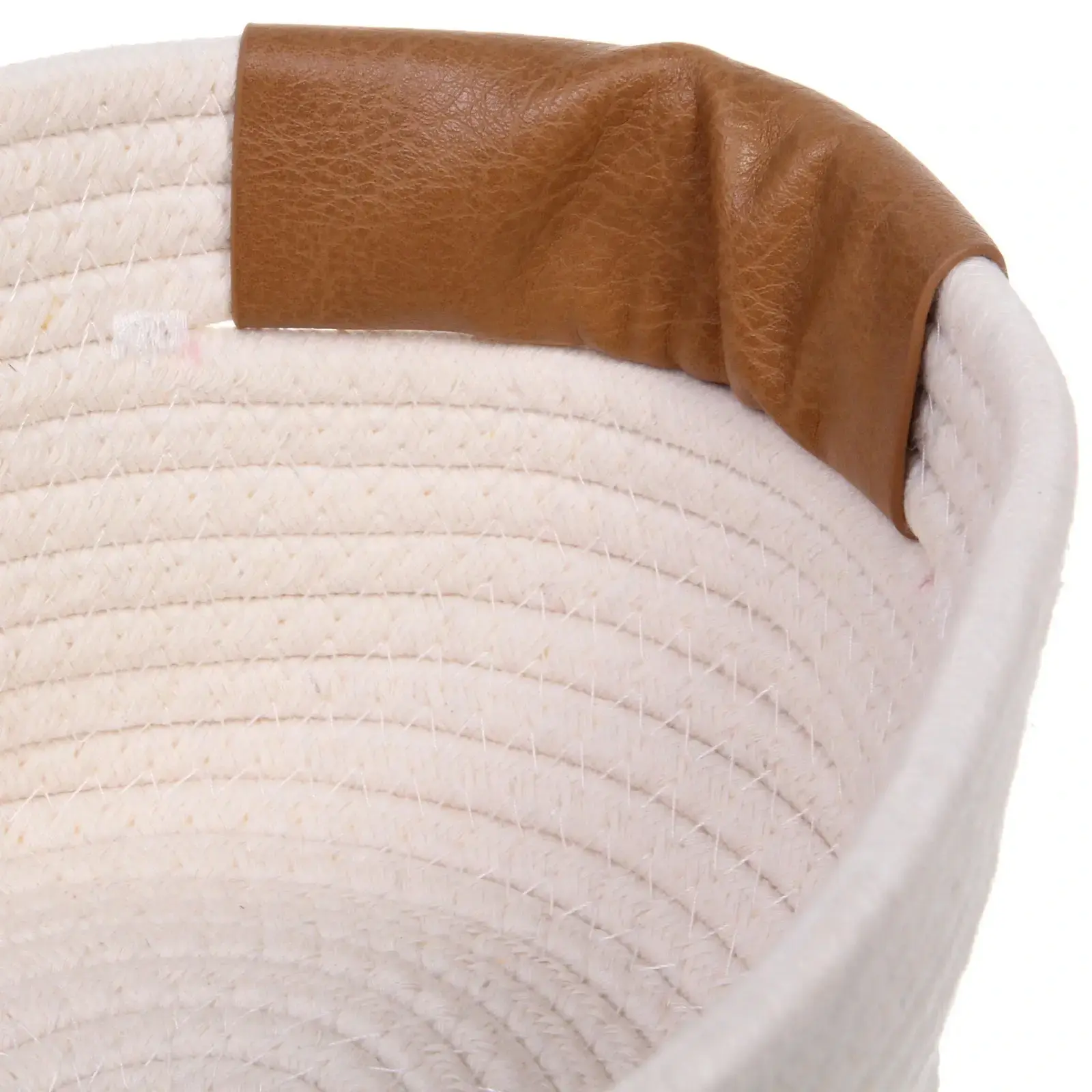 Корзинка выполнена из текстильного материала, что обеспечивает ей легкость и гибкость. Коричневые кожаные ручки с металлическими креплениями добавляют дополнительную прочность и стиль. Размеры корзины позволяют удобно размещать её на полках или в шкафах, а её нейтральный цвет делает её универсальным аксессуаром для любого интерьера.
