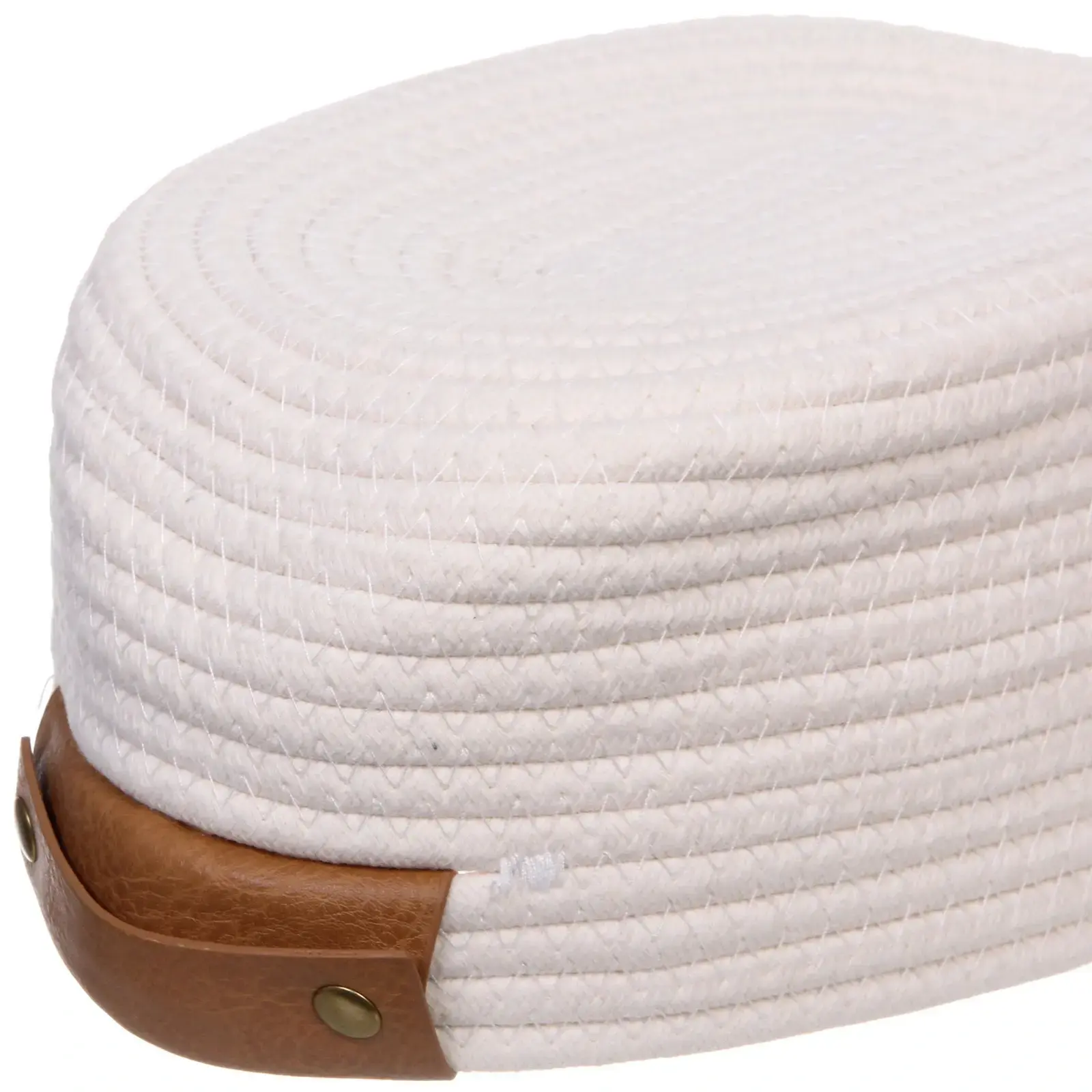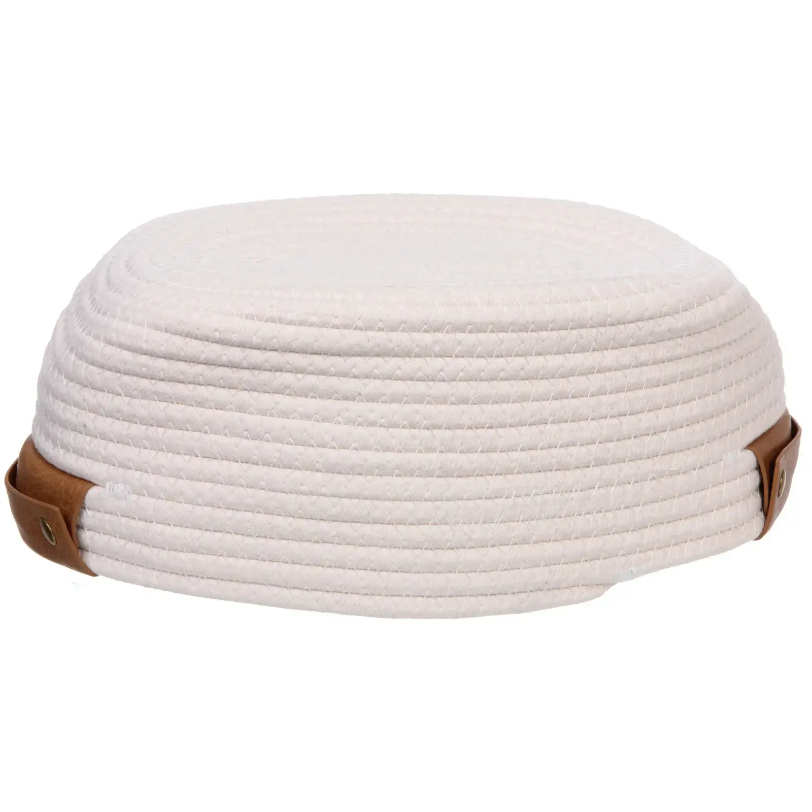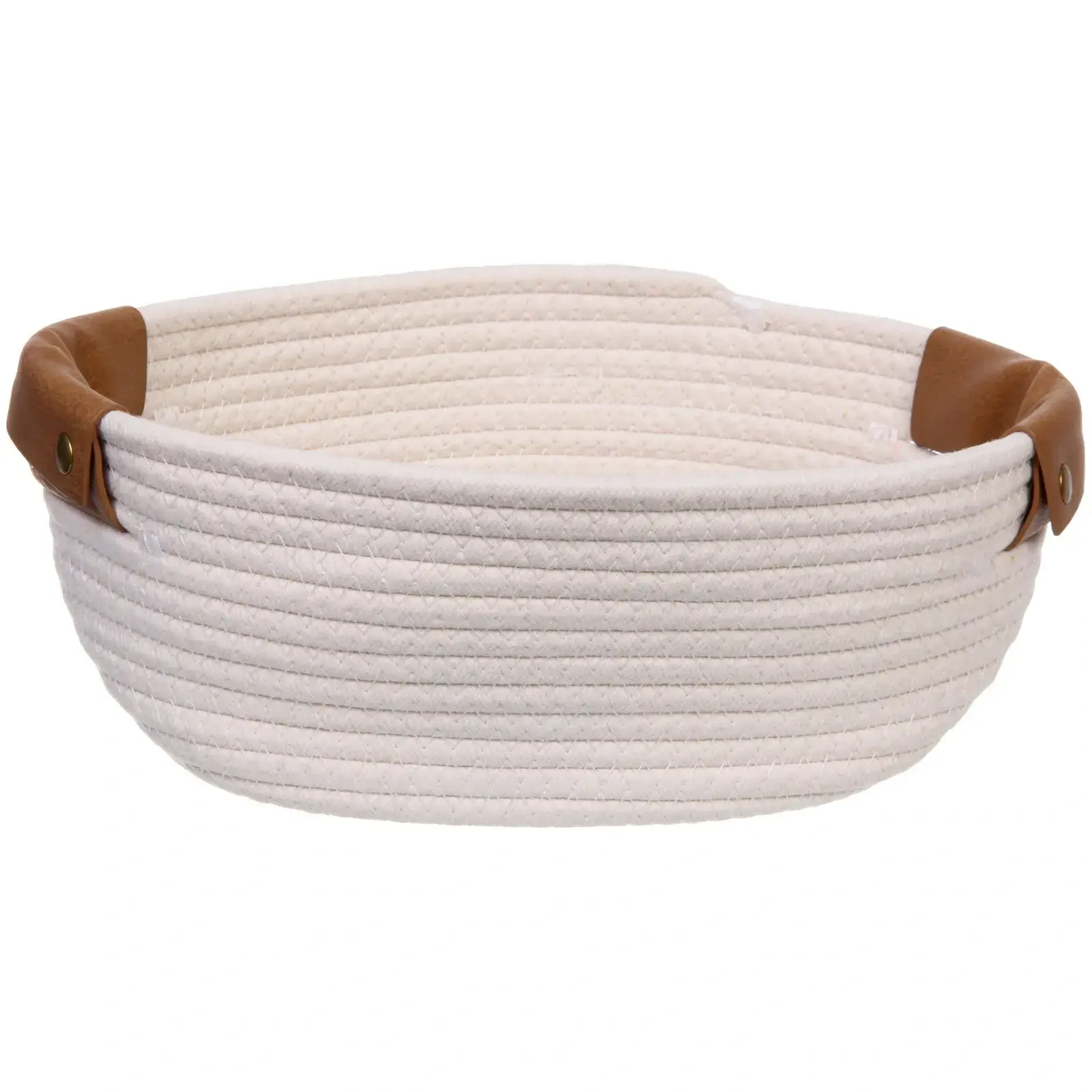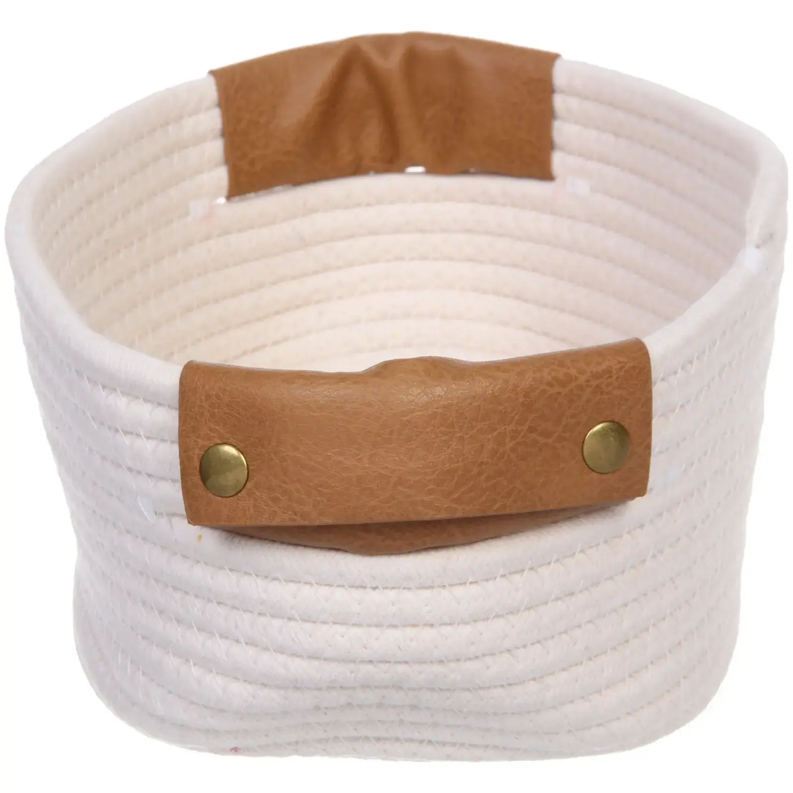 Корзинка выполнена из текстильного материала, что обеспечивает ей легкость и гибкость. Коричневые кожаные ручки с металлическими креплениями добавляют дополнительную прочность и стиль. Размеры корзины позволяют удобно размещать её на полках или в шкафах, а её нейтральный цвет делает её универсальным аксессуаром для любого интерьера.