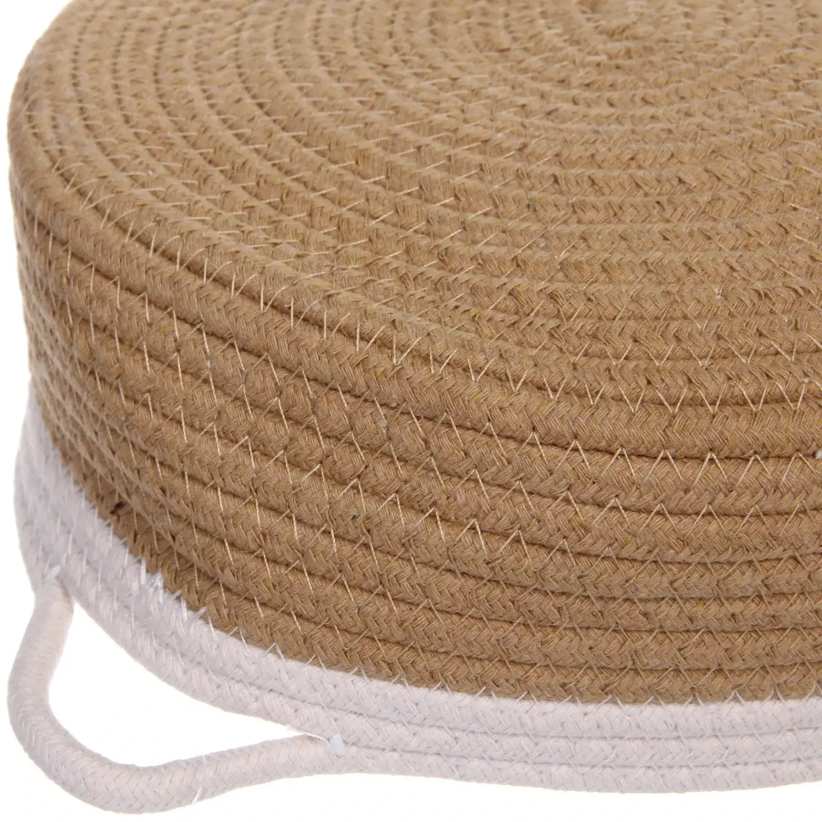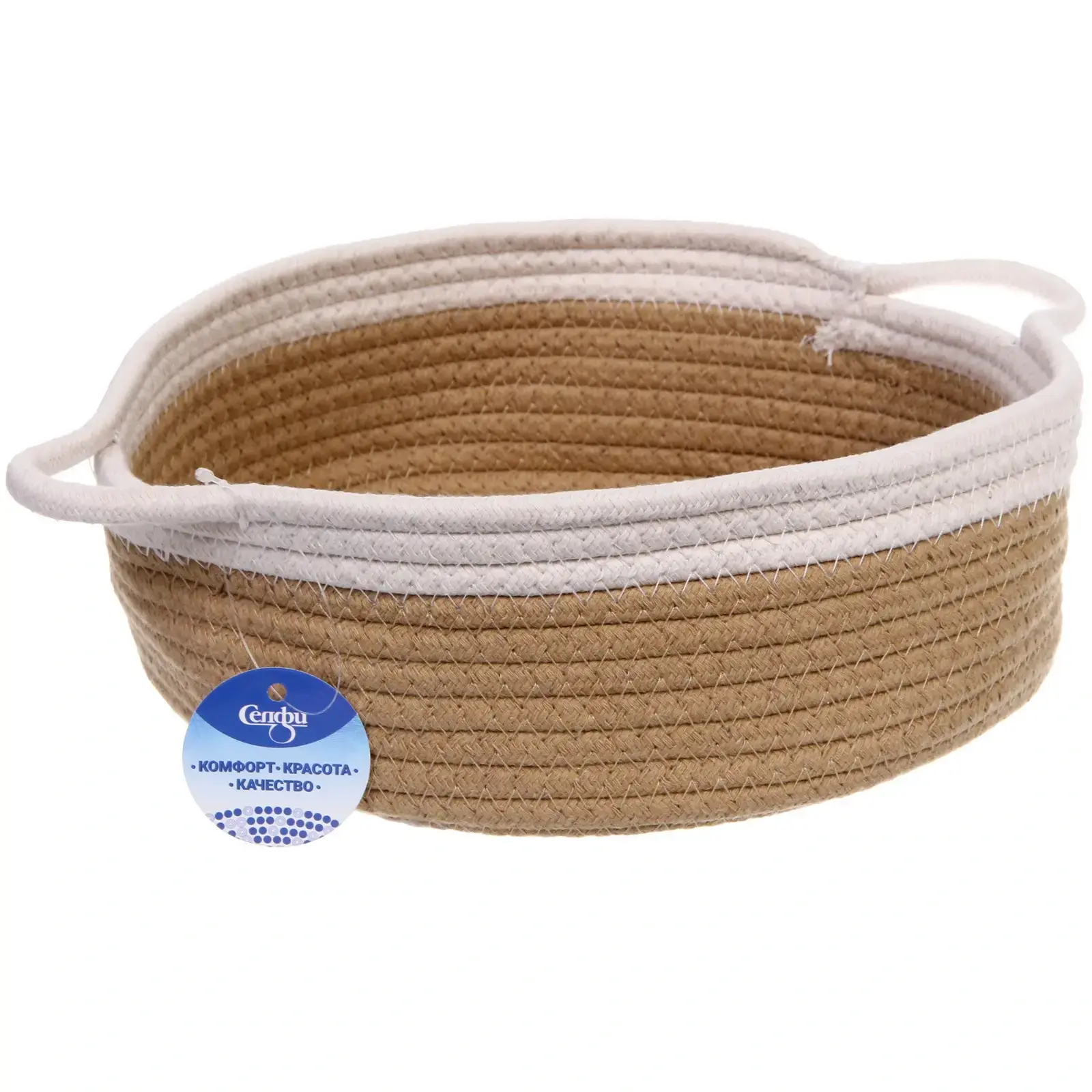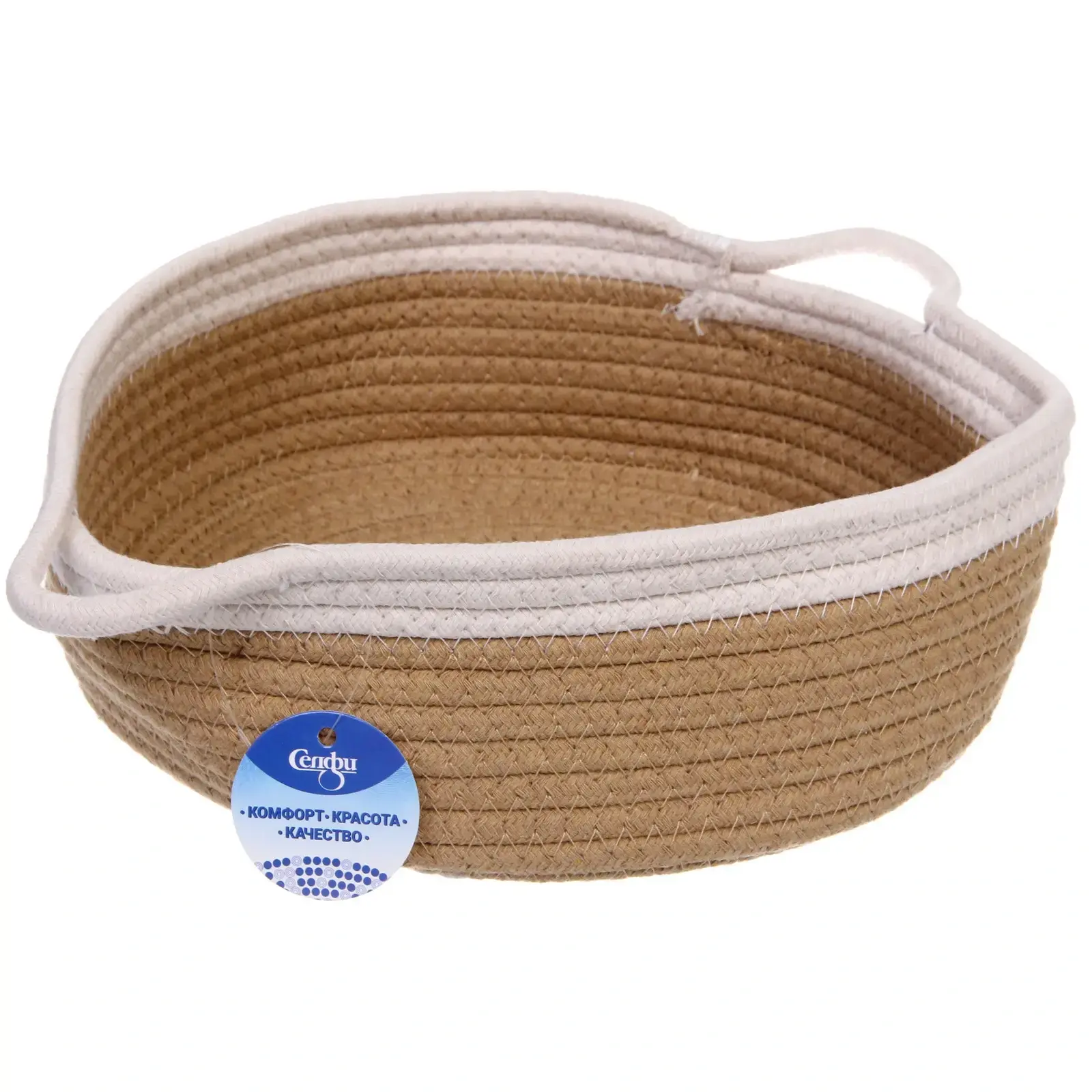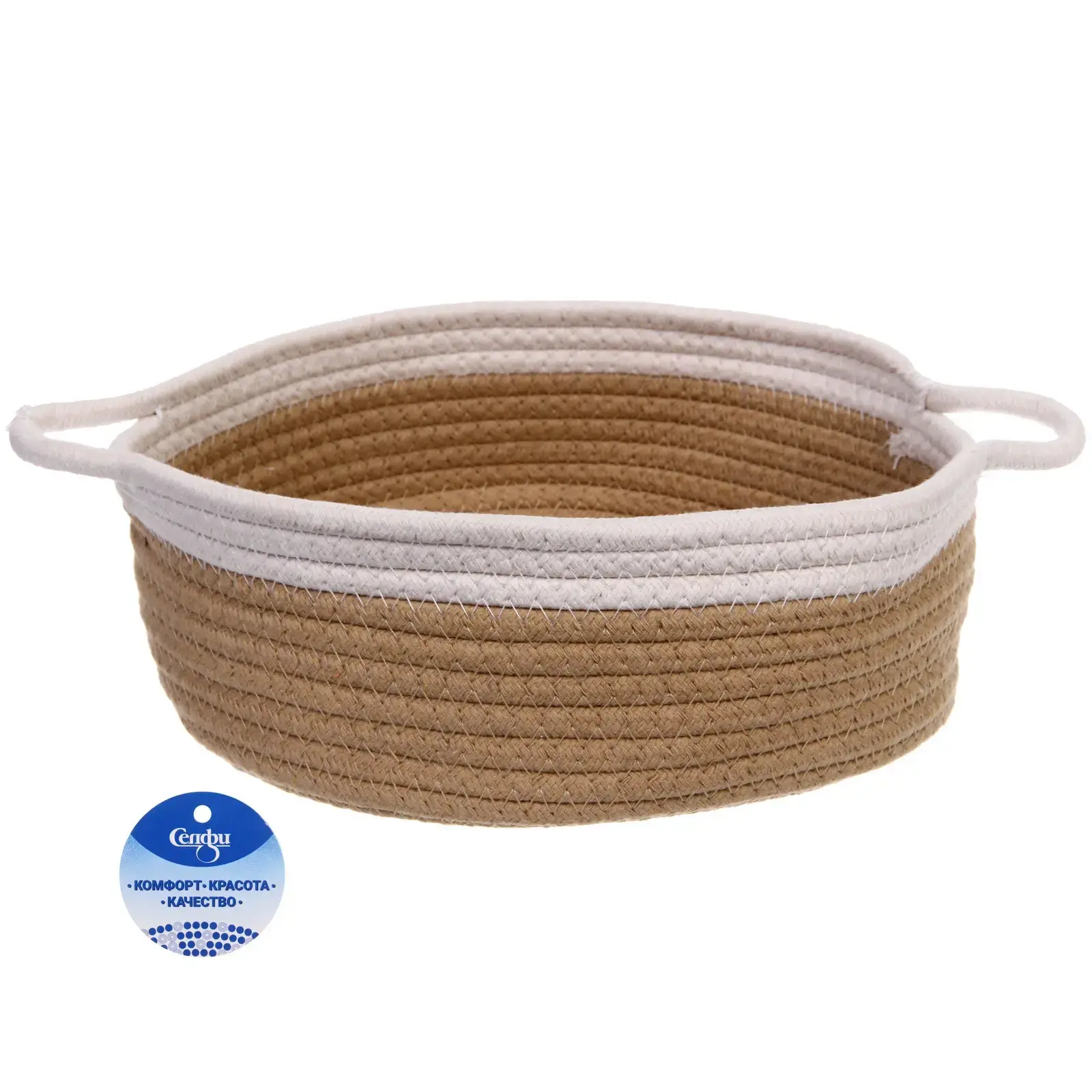 Корзинка выполнена из качественного текстильного материала, что обеспечивает её долговечность и устойчивость к износу. Плетёная структура не только придаёт ей стильный вид, но и делает её легкой и удобной в использовании. Цветовая комбинация бежевого и белого добавляет свежести и легкости, а также позволяет легко сочетать корзину с другими элементами декора.