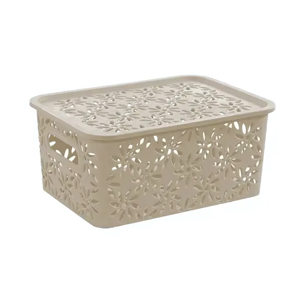 Эта пластиковая корзина объёмом 3 литра — идеальное решение для компактного и аккуратного хранения вещей. Благодаря закрывающейся крышке и боковым ручкам вся ваша мелочёвка или аксессуары будут всегда под рукой и скрыты от глаз. Корзина оснащена ажурным сквозным узором с цветочными мотивами, что добавляет интерьеру лёгкости и элегантности, а цвет латте легко впишется как в классическую, так и в современную обстановку.