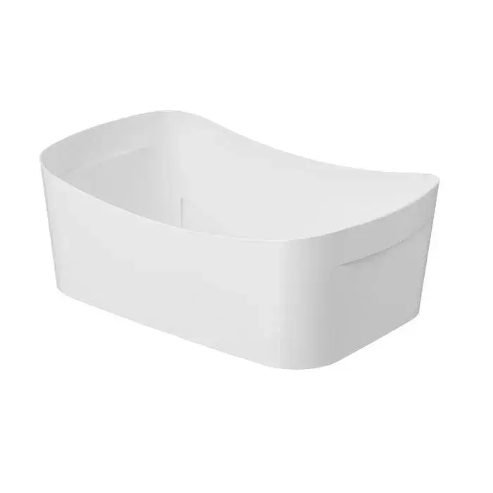 Корзинка изготовлена из экологичного полипропилена без резкого запаха. Габариты 29 см в длину и 10,5 см в высоту оптимальны для размещения на стандартных полках. Белый цвет гармонично впишется в любой интерьер, а гладкая поверхность легко очищается влажной губкой.