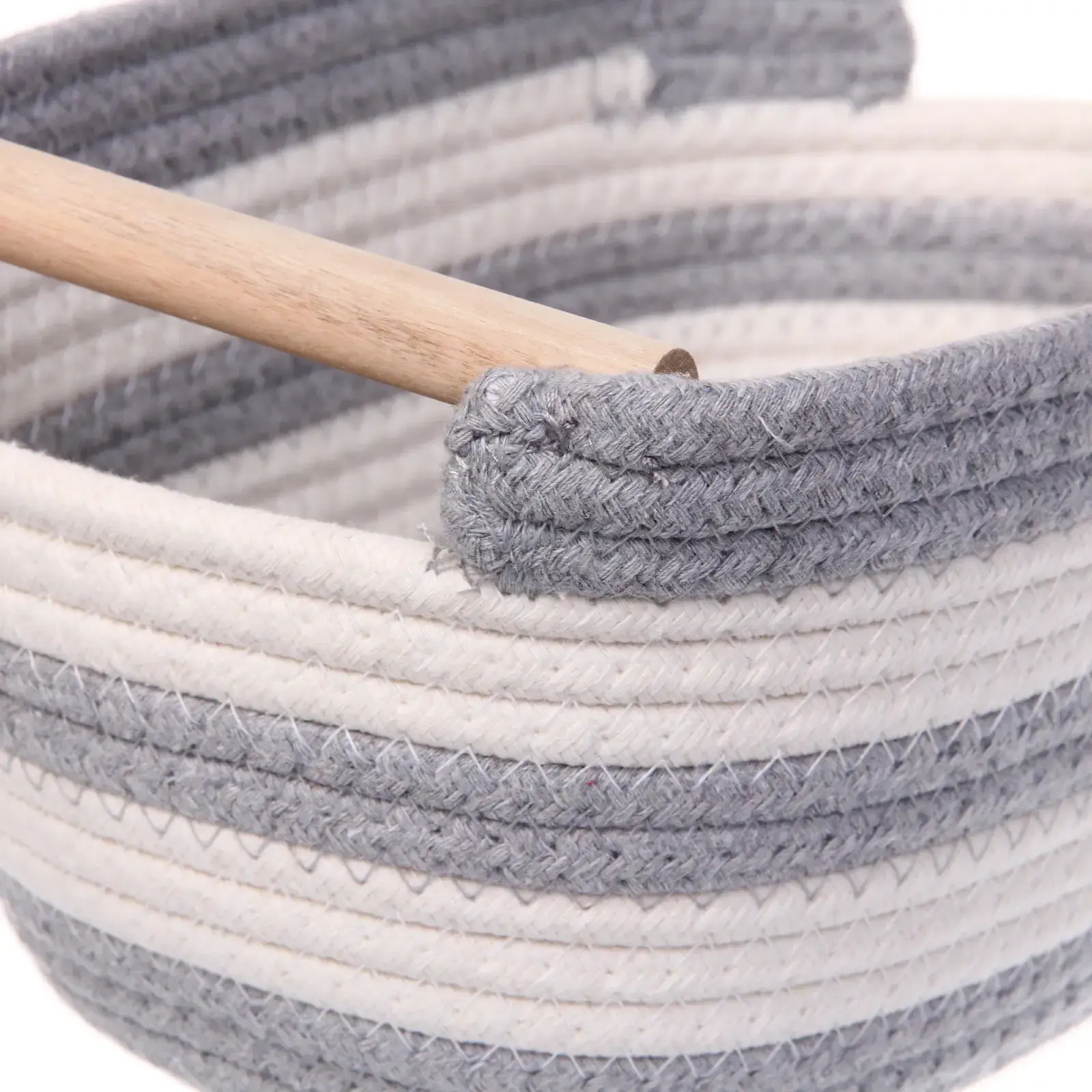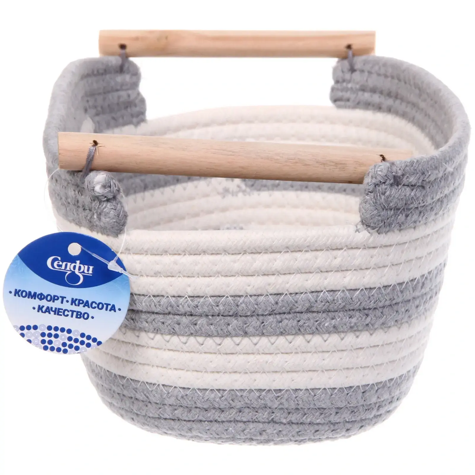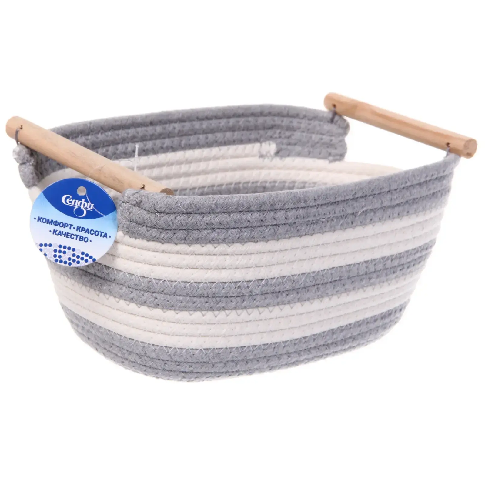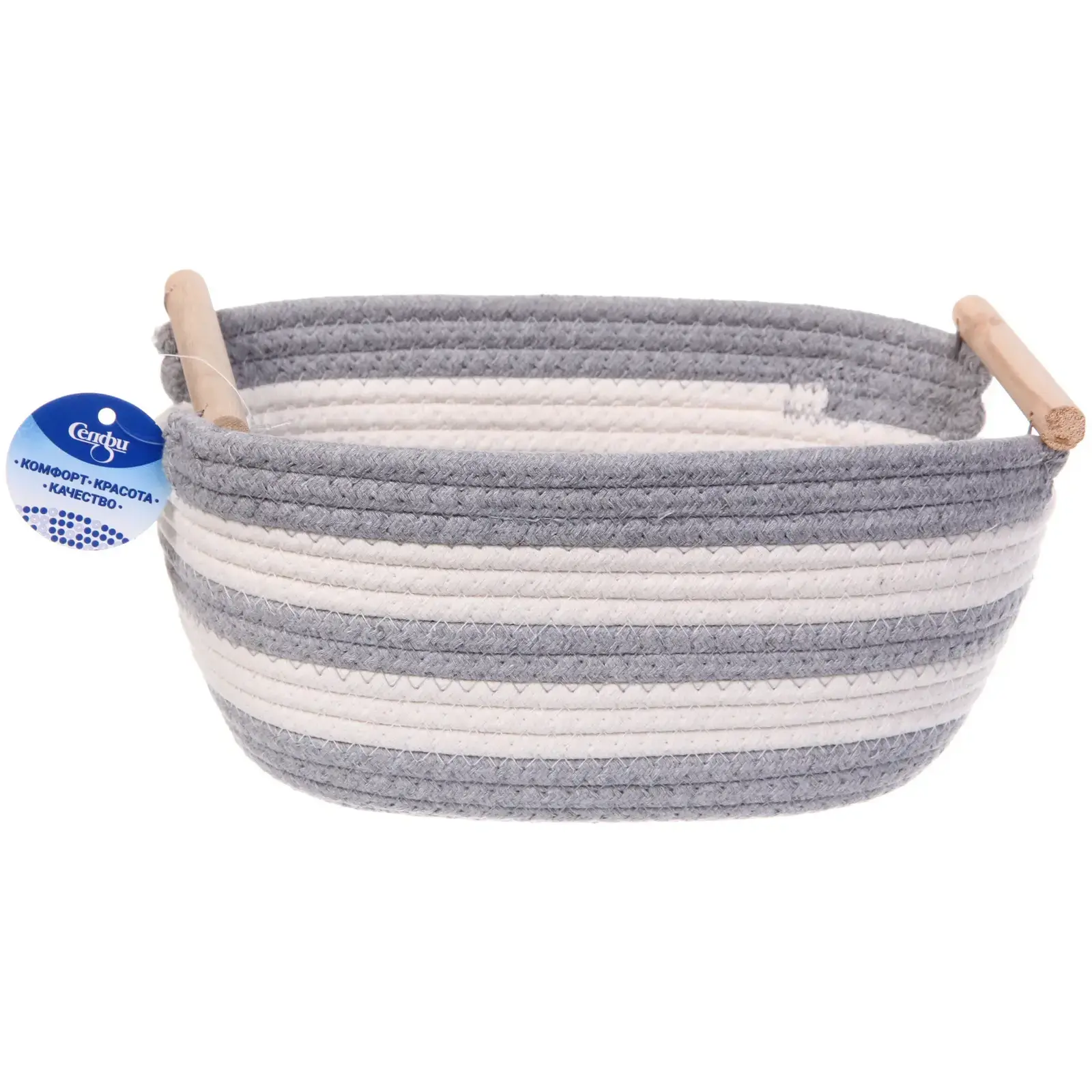 Корзинка вязаная «БИРГИТ» с деревянными ручками, серо-белая полоска, 28×20×13 см для интерьера