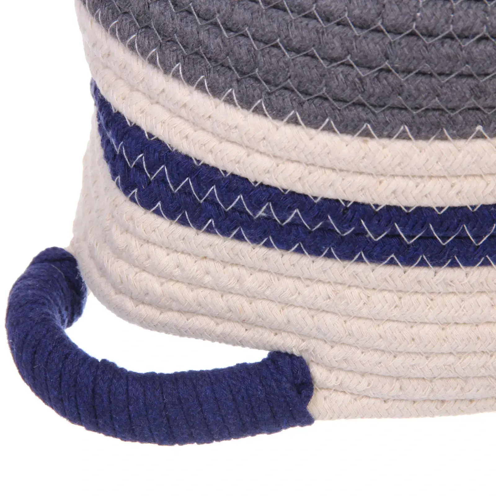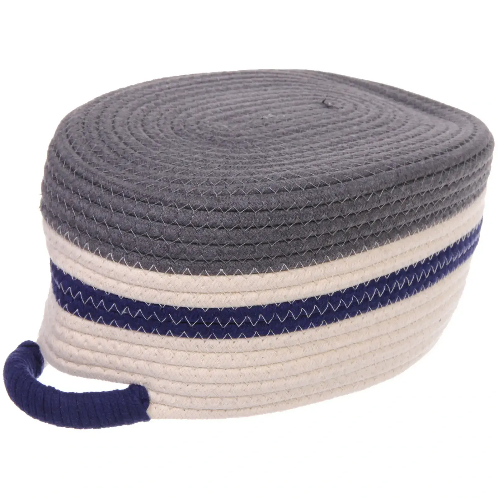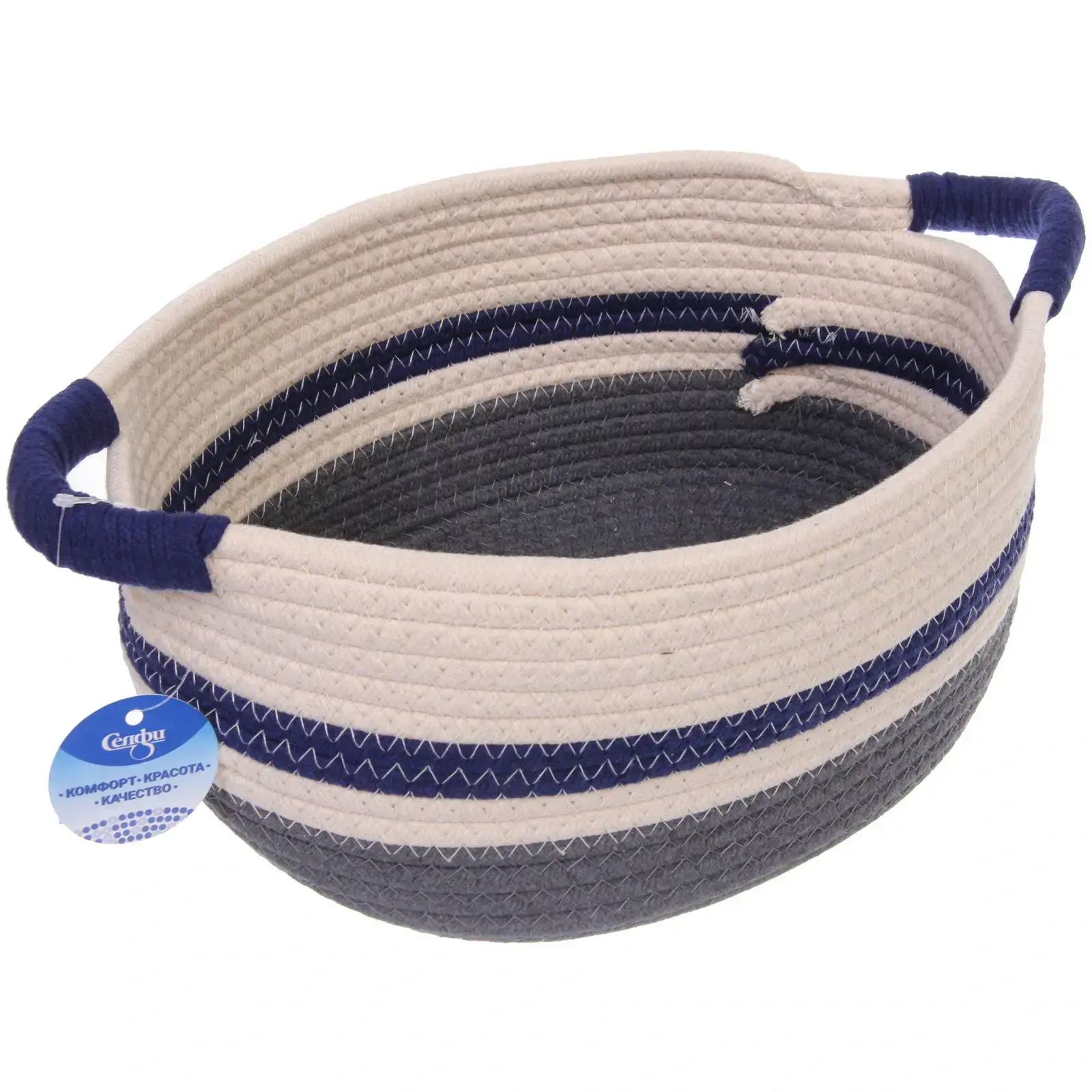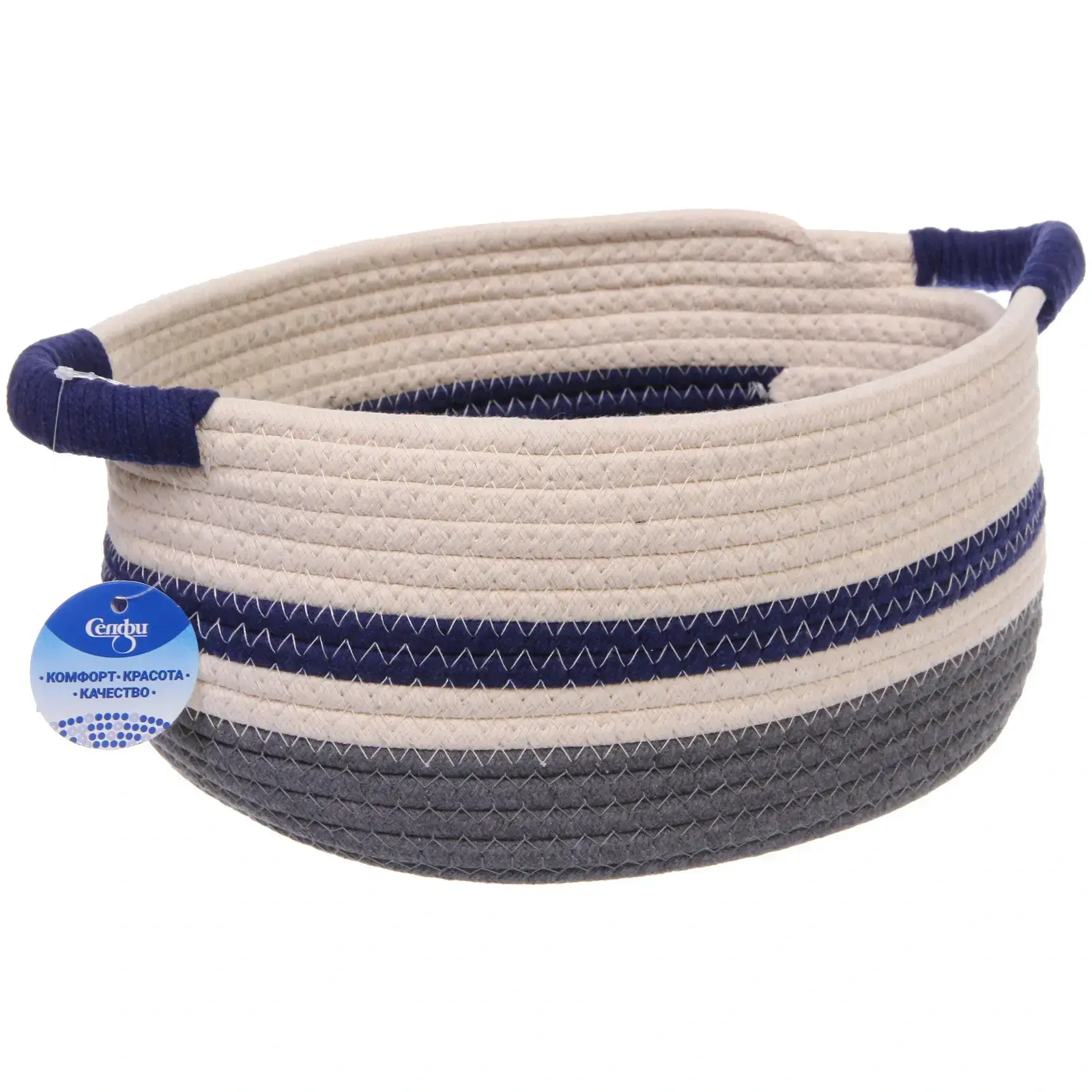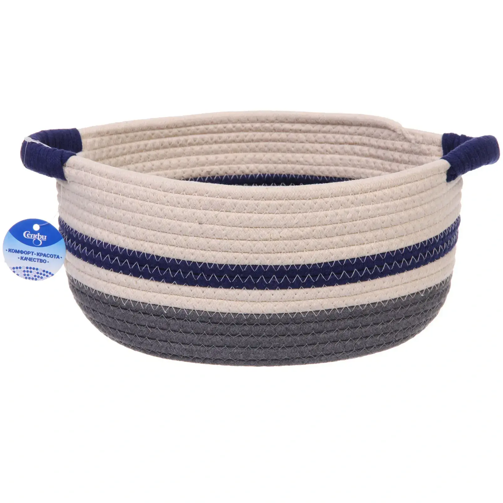 Корзинка выполнена из качественного текстильного материала, что обеспечивает её долговечность и надежность. Плетеная текстура добавляет эстетическую привлекательность, а сочетание синих и белых оттенков делает её универсальной для любого интерьера. Наклейка с надписью «Комфорт-Красота-Качество» подчеркивает высокие стандарты, которые были соблюдены при её производстве.