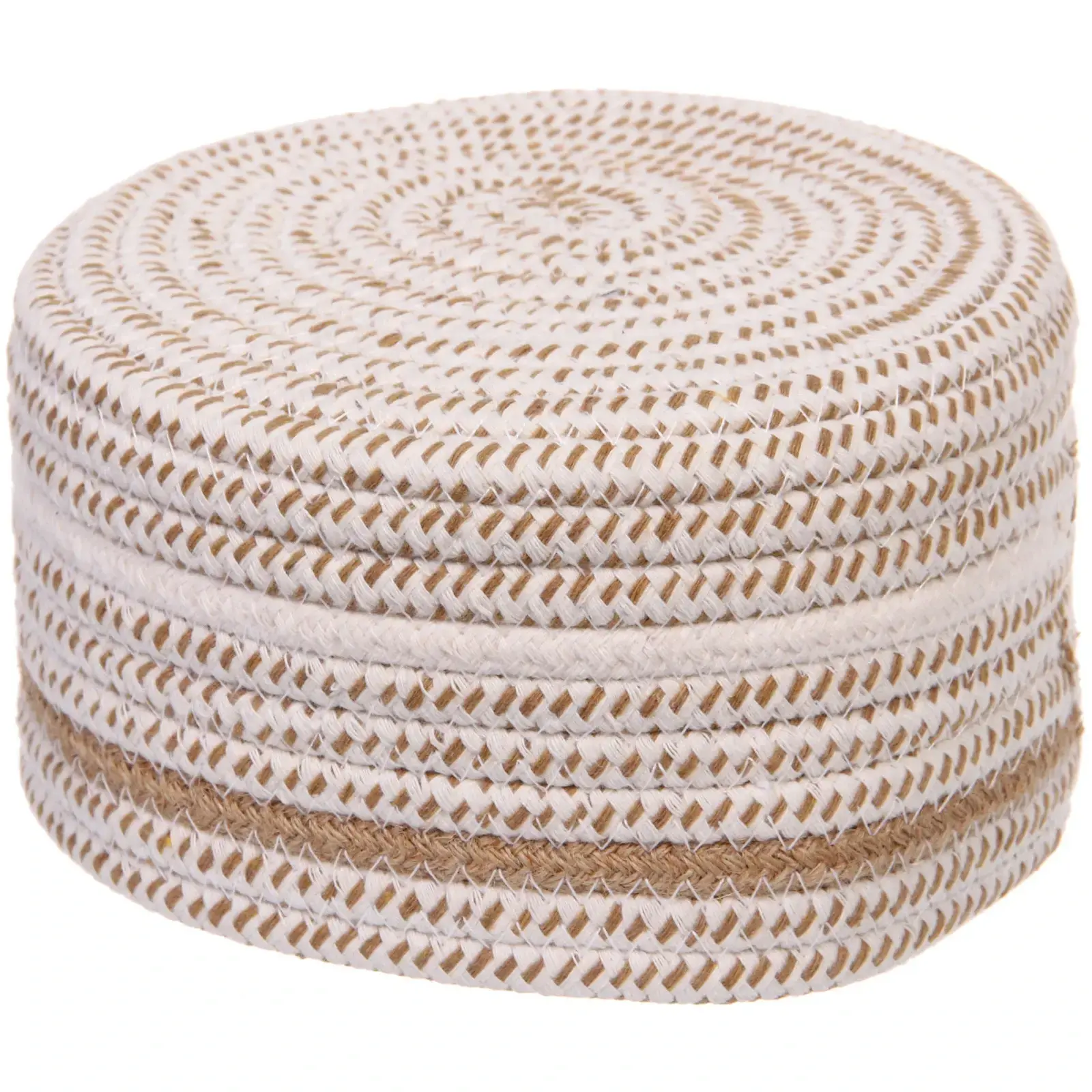 Компактные размеры (18 см в диаметре, 10 см высота) позволяют разместить корзинку на туалетном столике, полке или рабочем столе. Плотное плетение из износостойкого полиэстера сохраняет форму даже при ежедневном использовании.