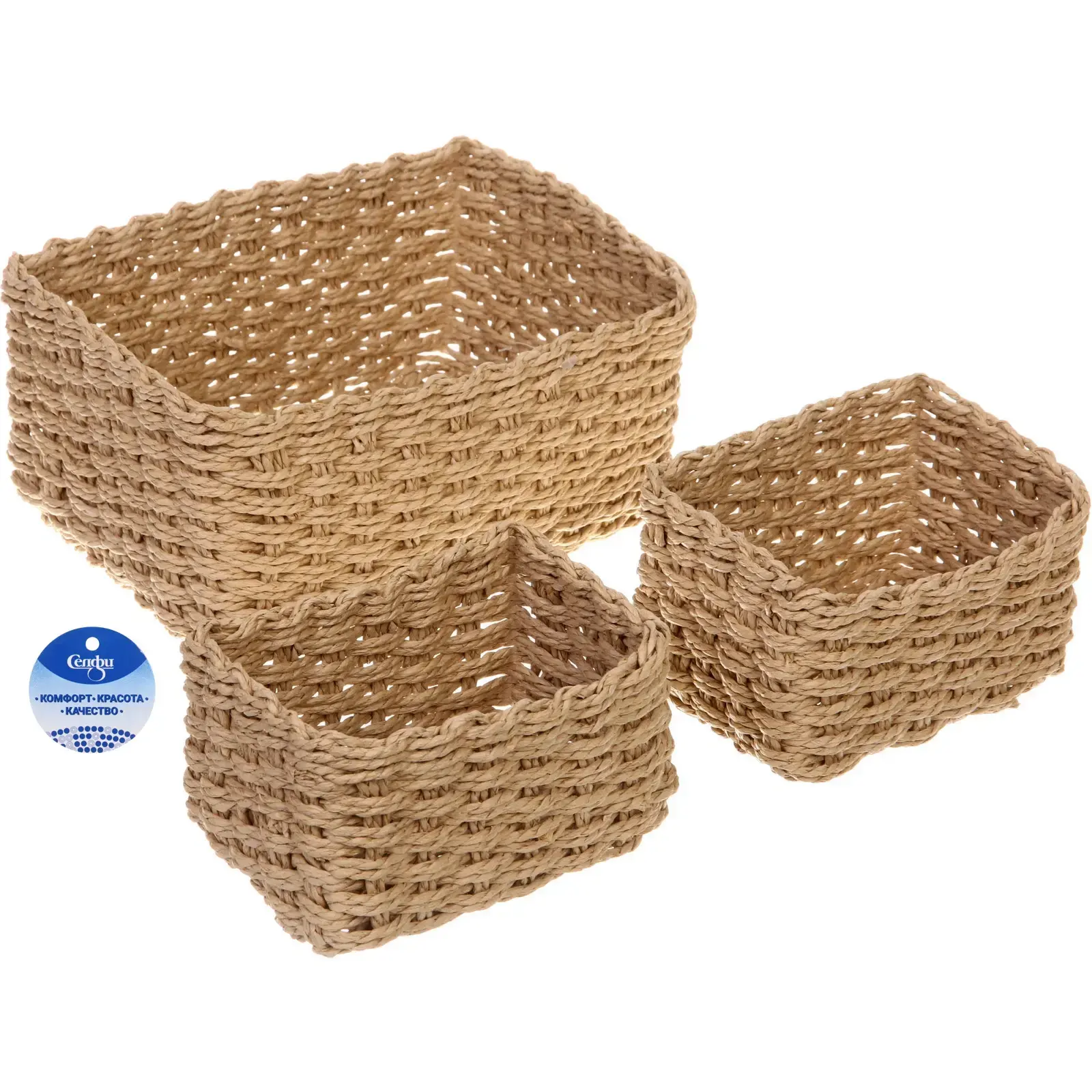 В набор входят три корзинки различных размеров: две маленькие (16х11х10 см) и одна большая (25х18х11,5 см). Все корзины выполнены из качественного плетеного материала, что делает их легкими и удобными в использовании. Размеры корзин позволяют использовать их как по отдельности, так и в комбинации, создавая уникальные решения для хранения.
