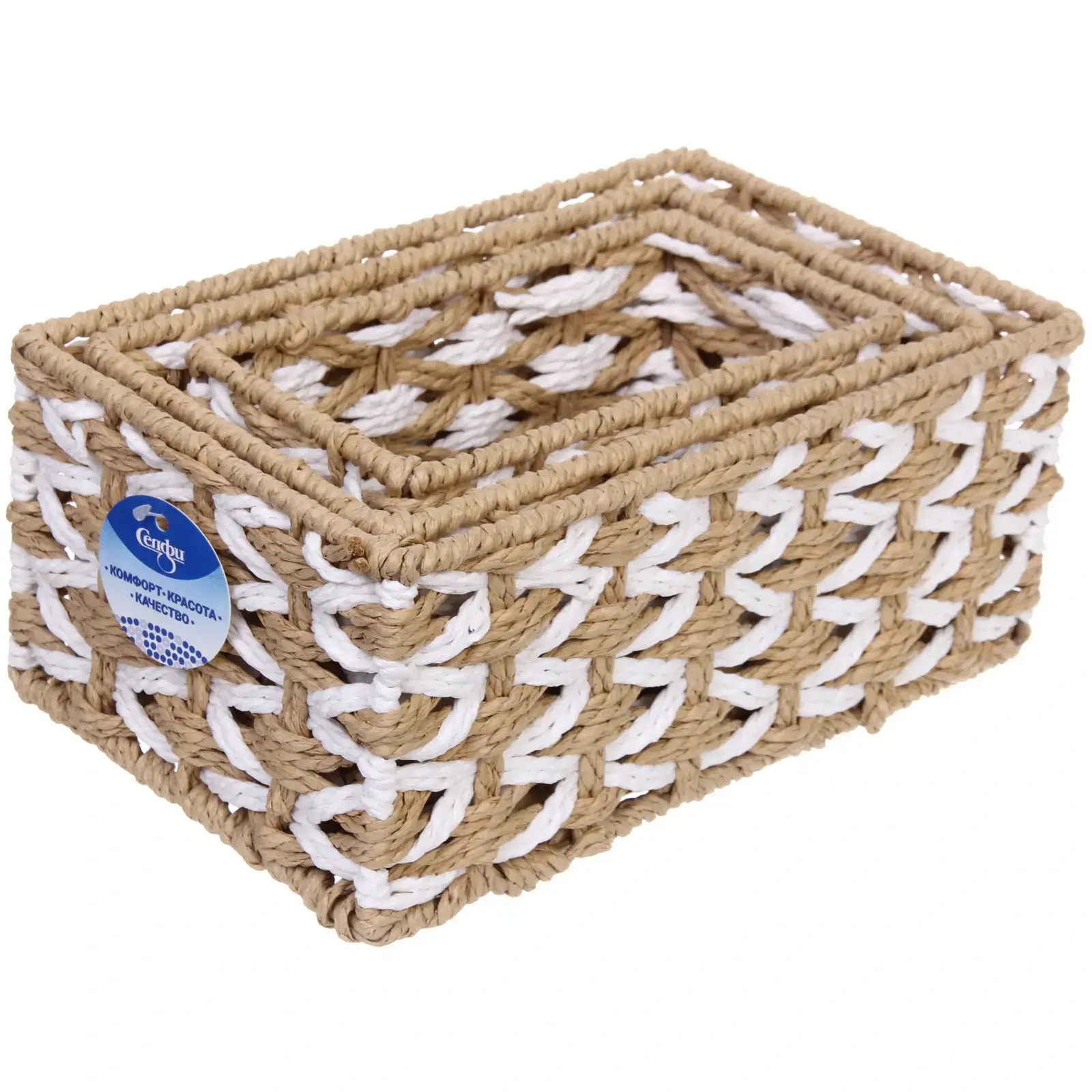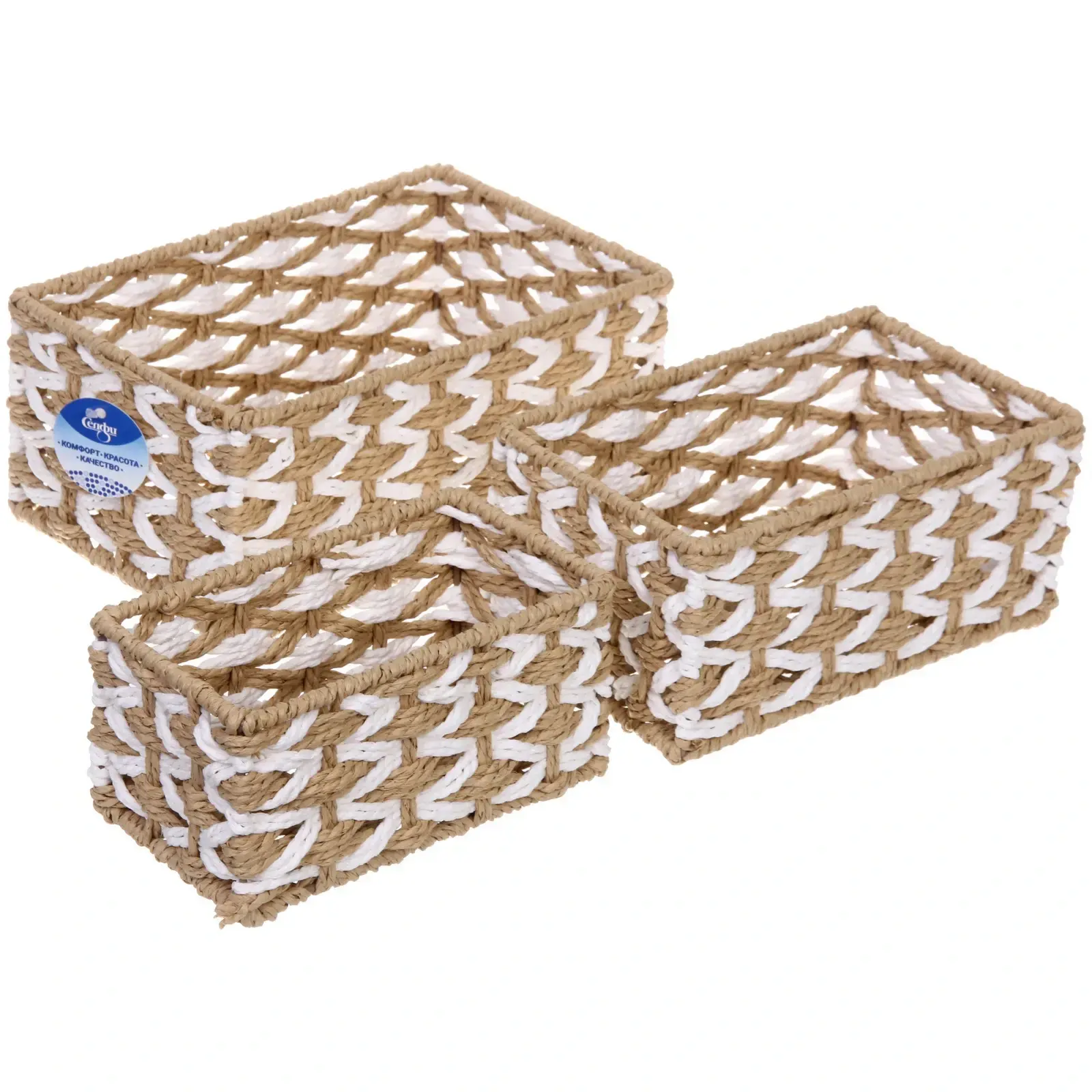 Корзины имеют прямоугольную форму и выполнены из натуральных материалов, что делает их безопасными для использования в любом помещении. Благодаря открытым краям, вы всегда сможете видеть содержимое, что упрощает поиск нужных вещей. Набор включает три корзины разных размеров: 28*18*12 см, 24*15*11 см и 20*11*10 см, что позволяет использовать их в различных целях и помещениях.