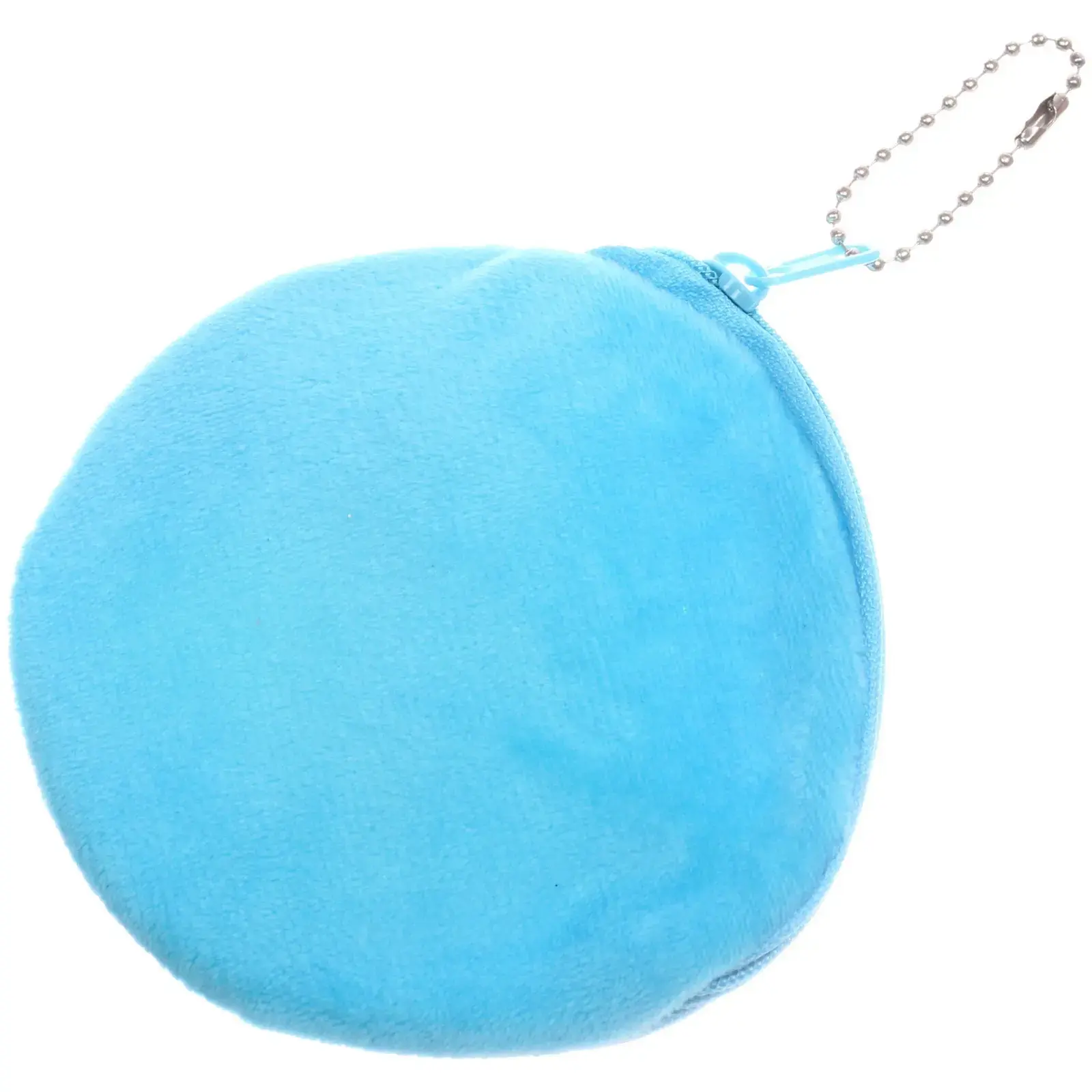 Размер кошелька составляет 11 см в диаметре, что делает его компактным и удобным для ношения. Цветовая гамма включает светло-голубые и фиолетовые оттенки, что добавляет ему игривости. Кошелек также имеет металлическую цепочку для крепления, что позволяет избежать потери и легко носить его с собой.