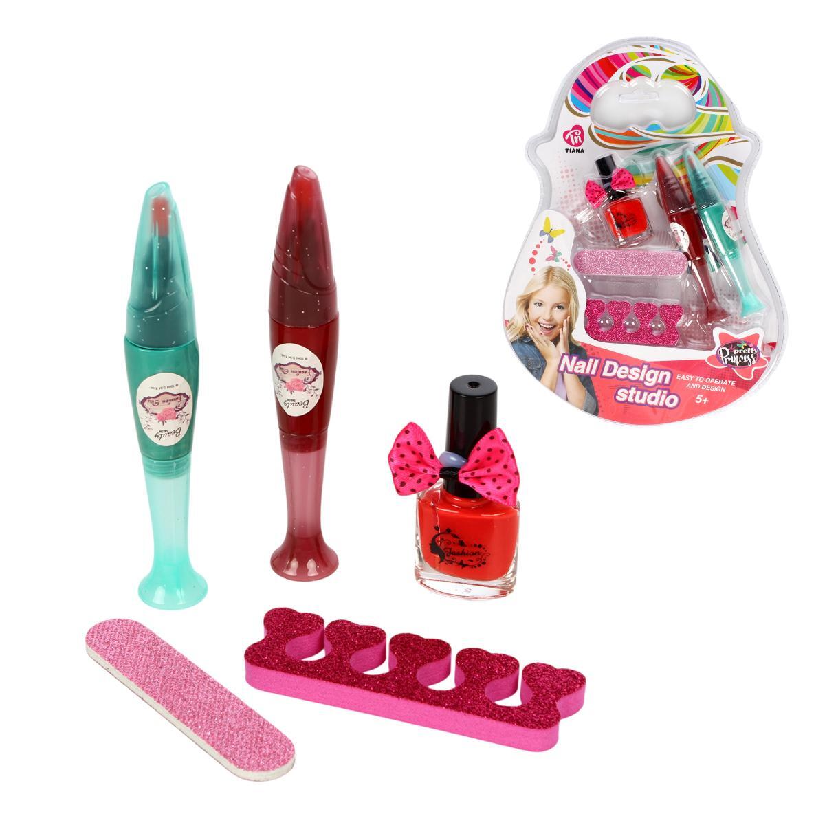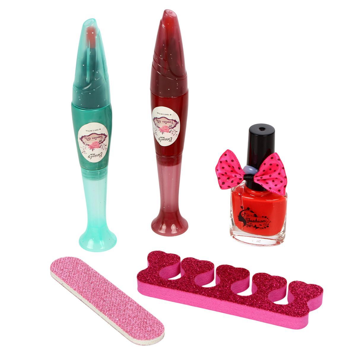Косметический набор включает в себя два флакона лака для ногтей (красный и зеленый), два блеска для губ, пилочку для ногтей и разделитель для пальцев. Все элементы набора легко использовать, что делает его идеальным для юных модниц, которые хотят попробовать себя в роли настоящих стилистов.