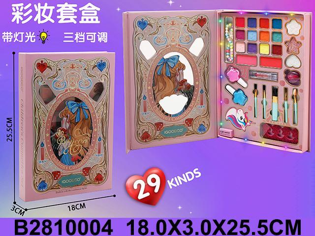 Размер упаковки составляет 18,0 * 3,0 * 25,5 см, что делает его удобным для хранения и транспортировки. В набор входят 29 различных косметических средств, включая блестки и кисти для нанесения. Все элементы упакованы в стильную коробку с цветочным узором и изображением персонажа, что добавляет дополнительный шарм.
