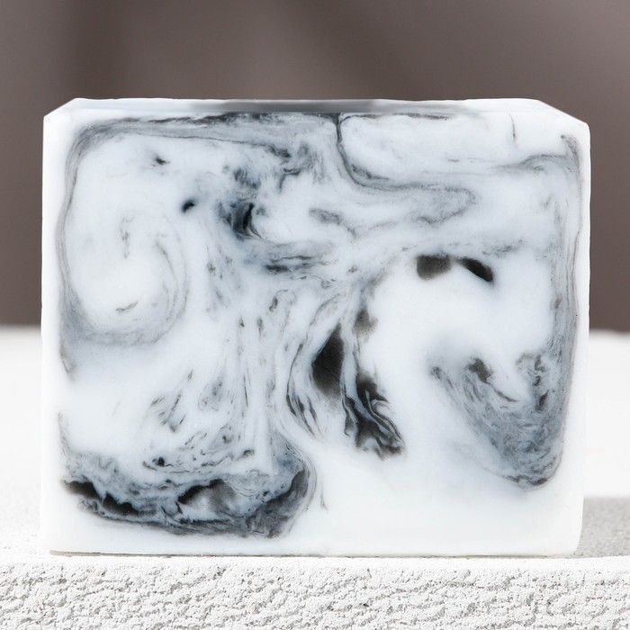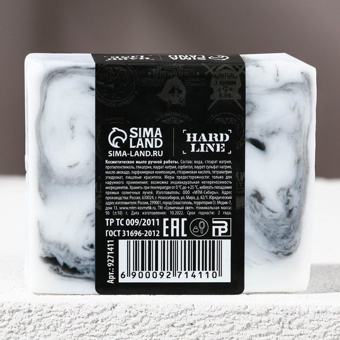 Объем мыла составляет 90 гр, а его форма прямоугольная с округлыми углами. Основной цвет — белый с черными и серыми мраморными разводами, что придает ему стильный и мужественный вид. Упаковка выполнена в черном цвете с выразительным текстом, подчеркивающим его предназначение.