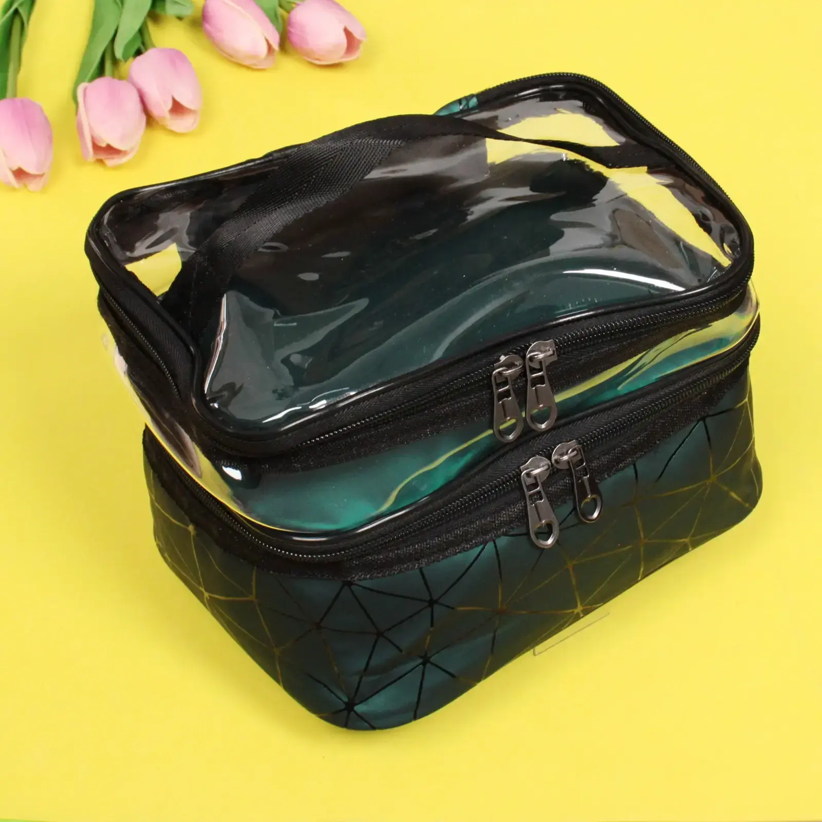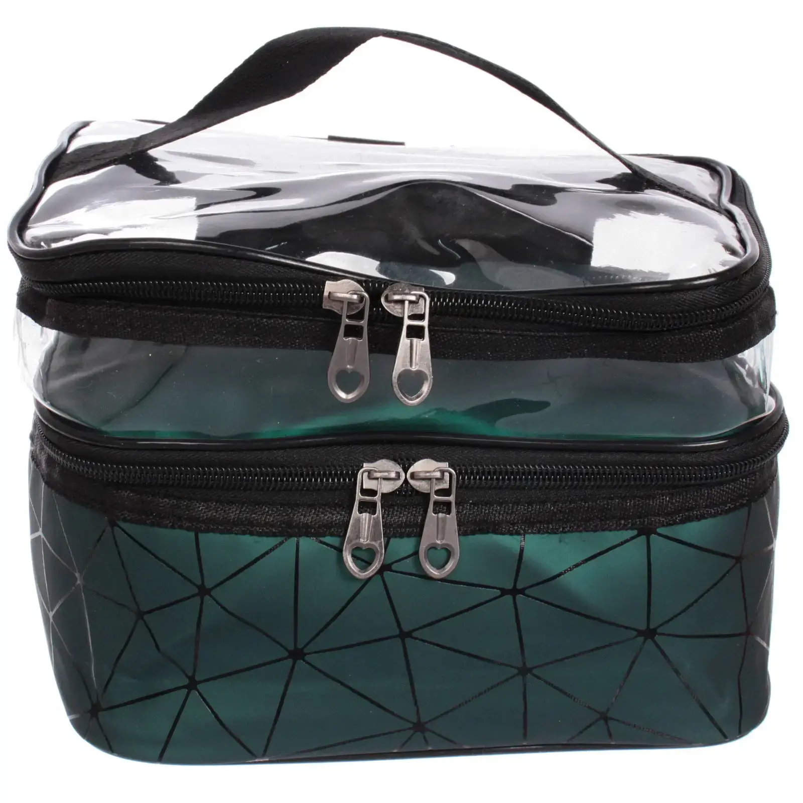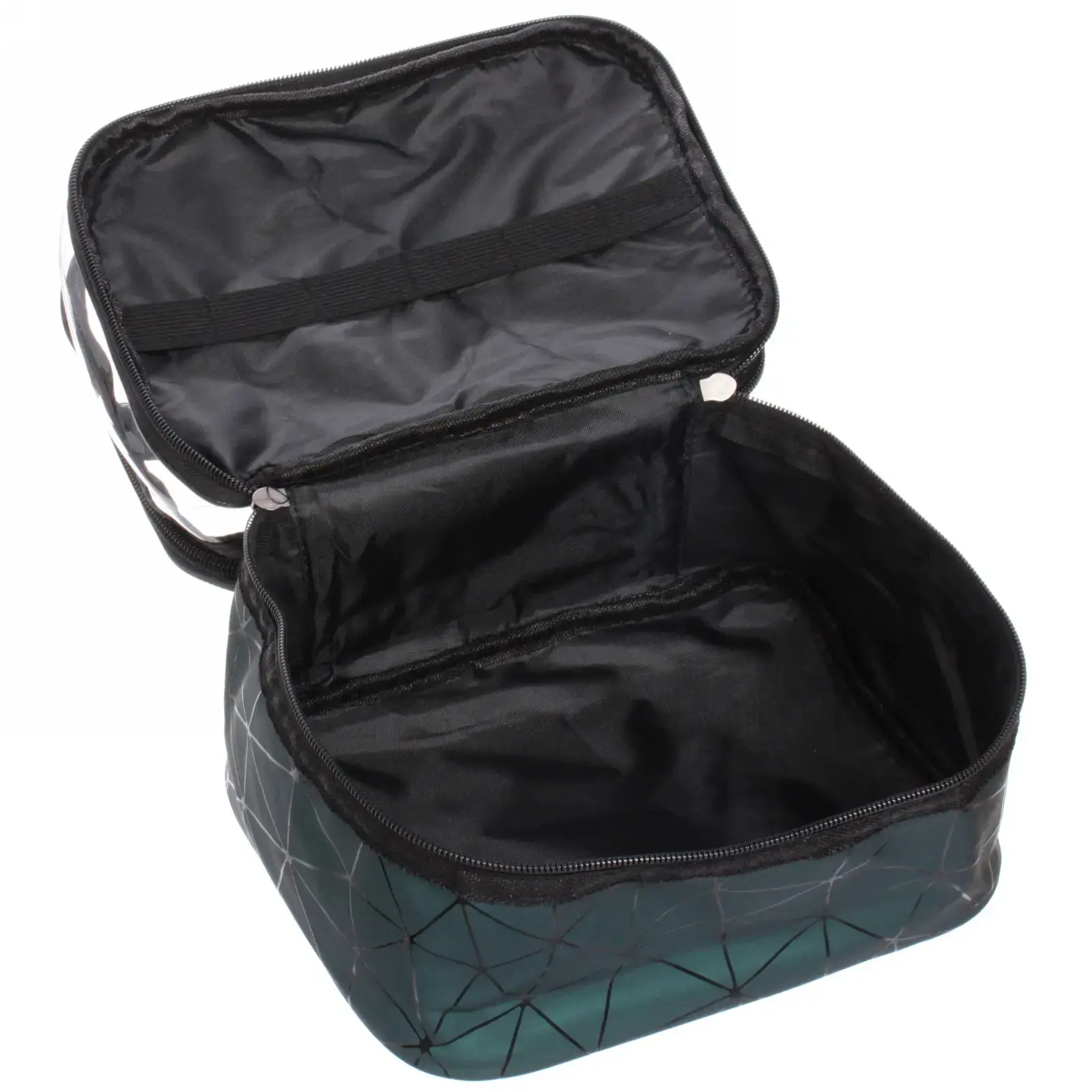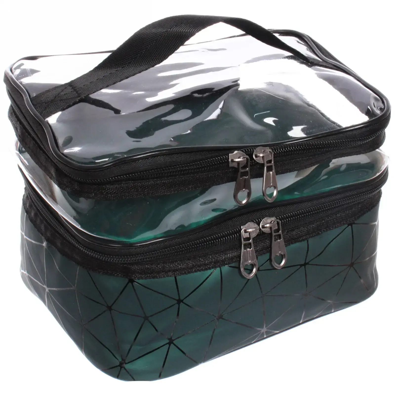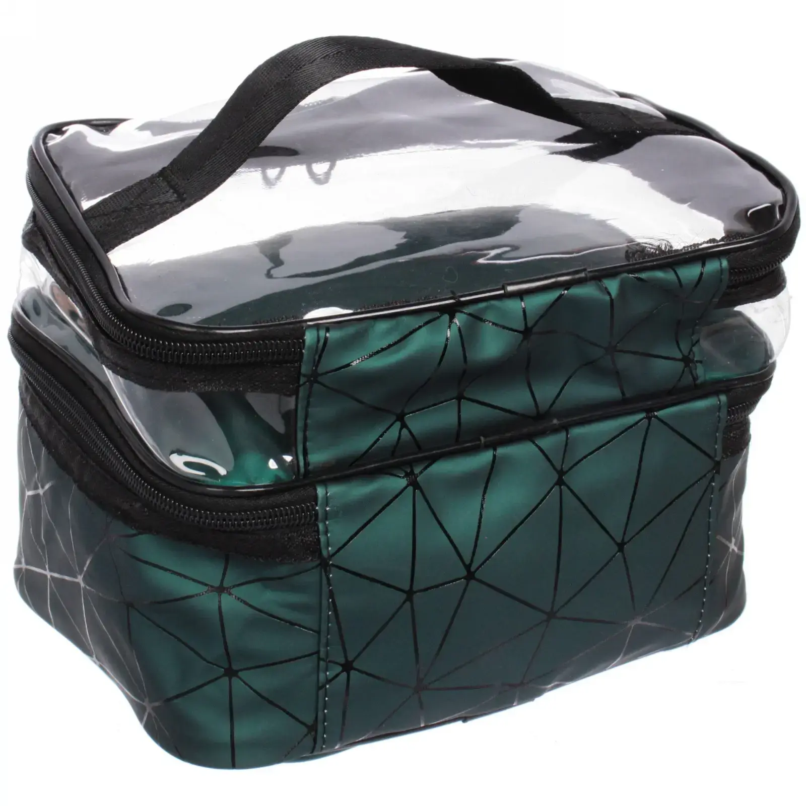 Косметичка имеет два основных отделения, что позволяет удобно разделить ваши вещи. Прозрачная верхняя часть дает возможность видеть содержимое, а темно-зеленый цвет с геометрическим узором добавляет стильный акцент. Благодаря компактным размерам 22,8х15х17 см, она легко помещается в сумку или чемодан, что делает её идеальной для путешествий.
