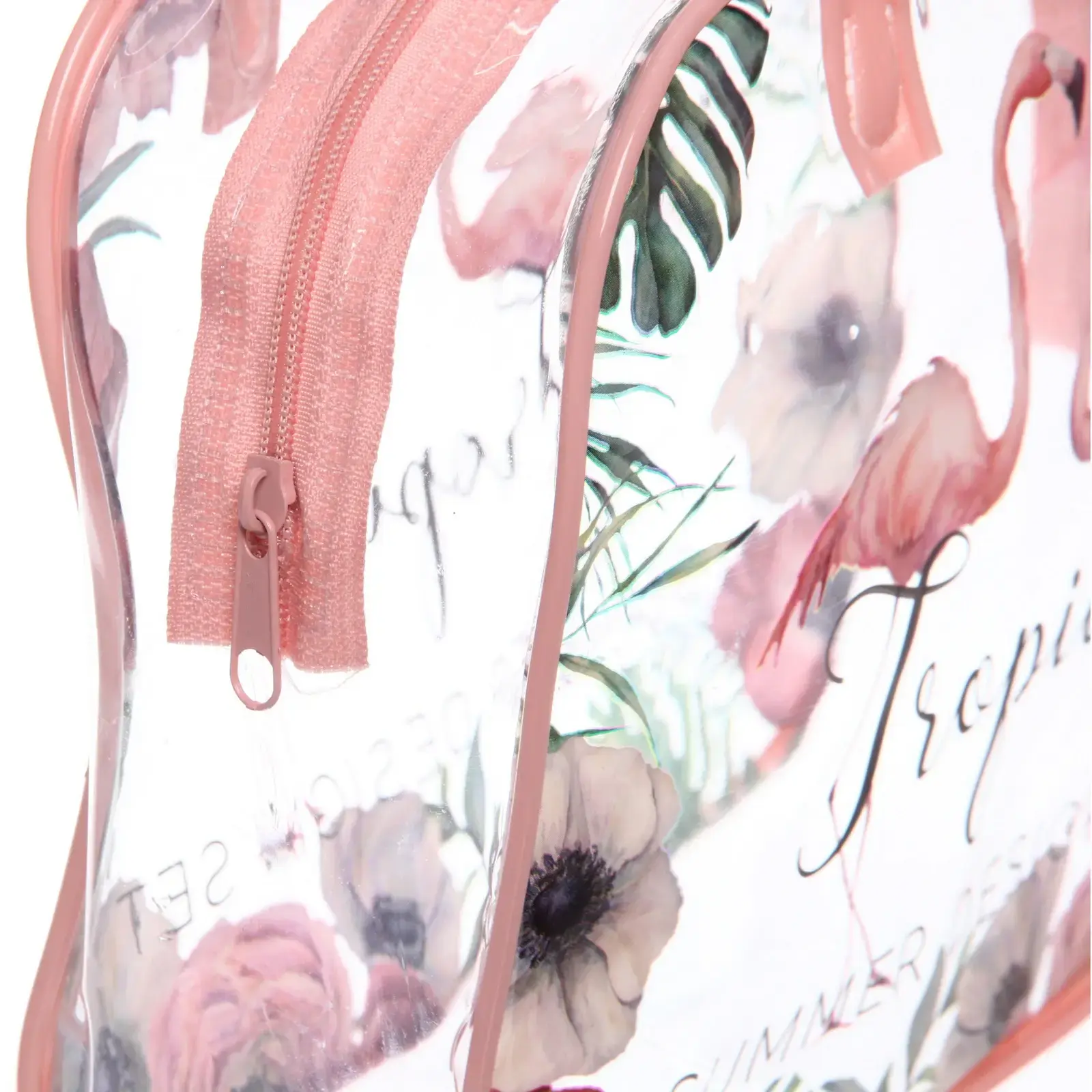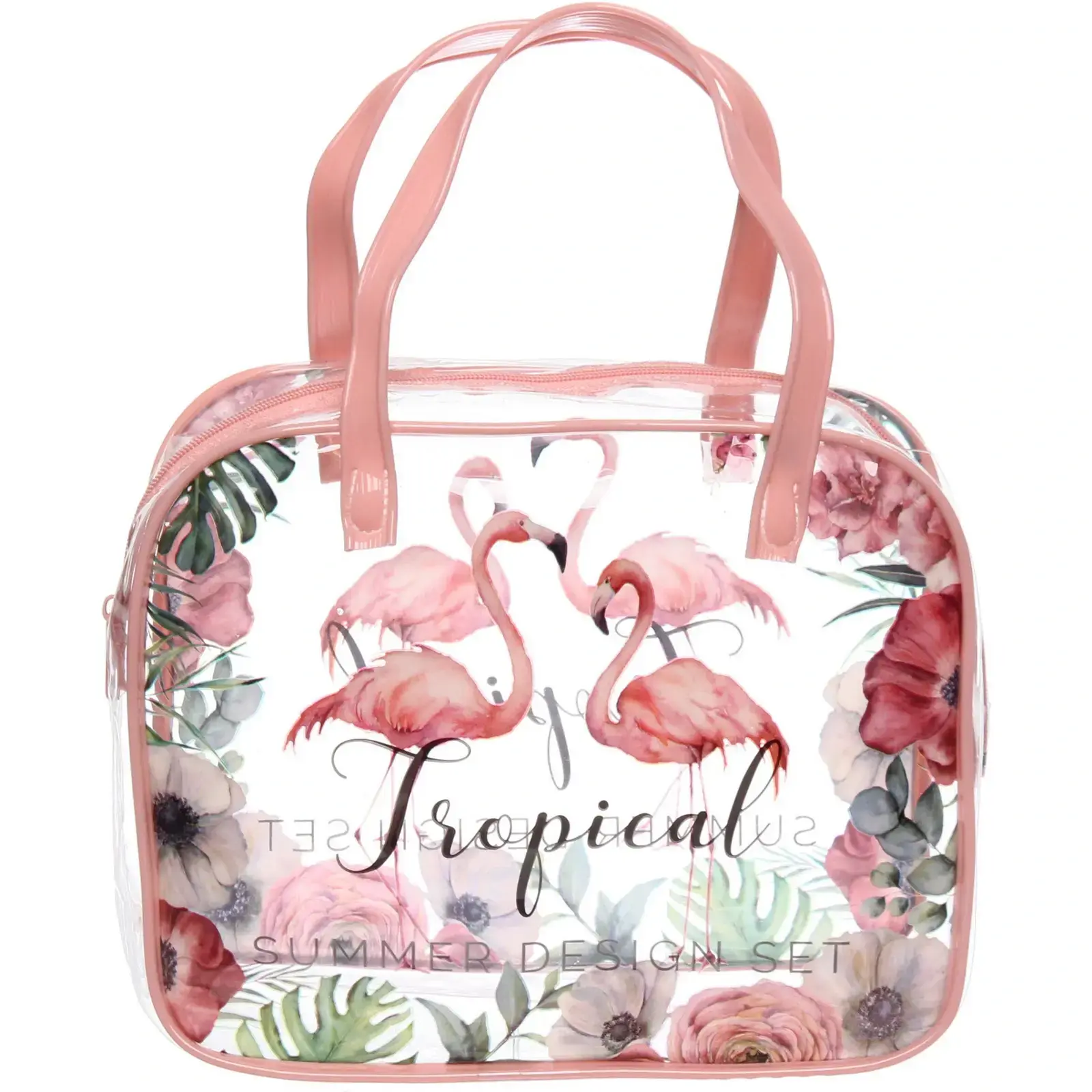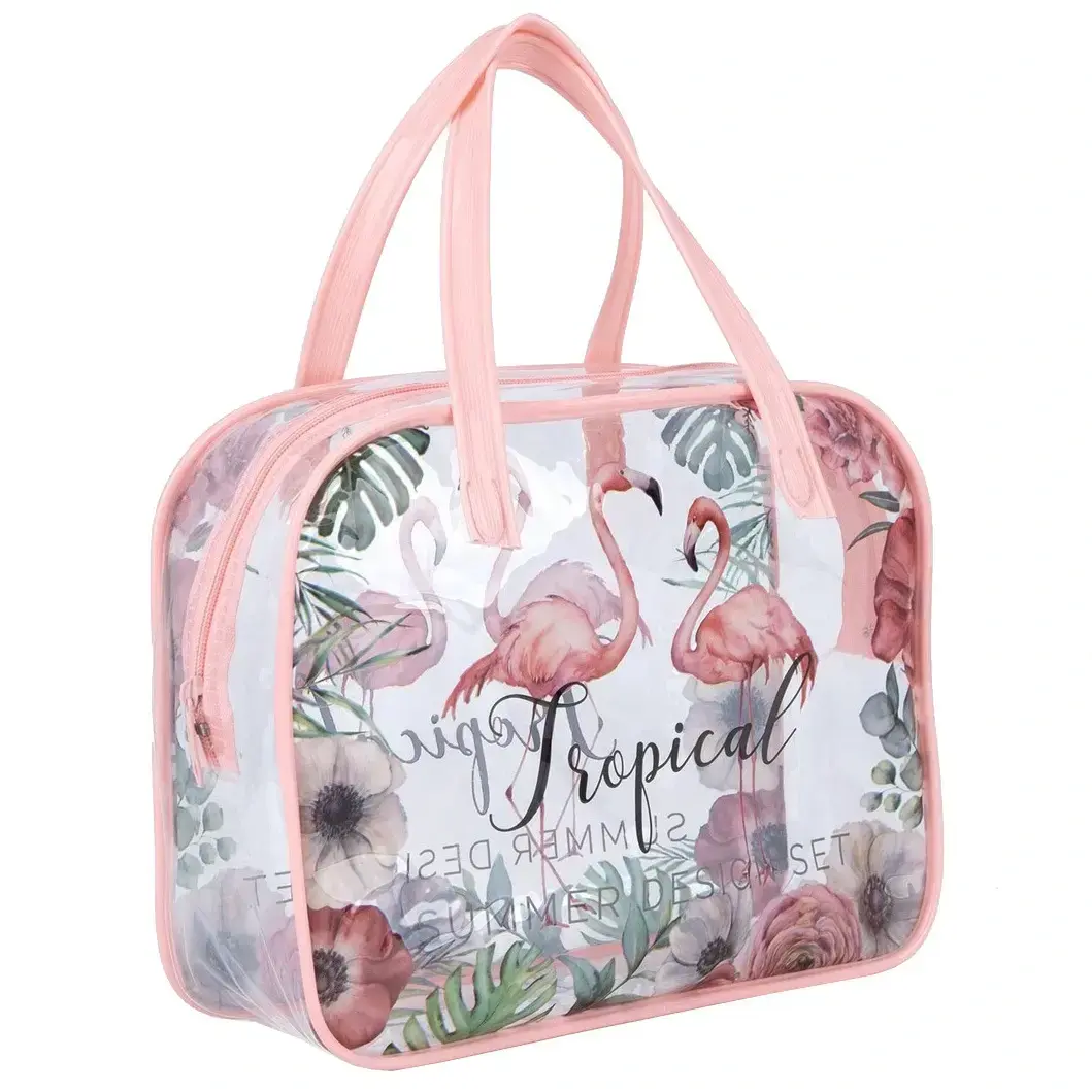 Эта косметичка станет вашим незаменимым помощником в организации косметических средств и аксессуаров. Яркий дизайн с изображением фламинго и цветочных мотивов добавит летнего настроения в ваш повседневный уход. Прозрачный материал позволяет легко находить нужные вещи, а розовая окантовка и ручки делают её стильной и удобной.