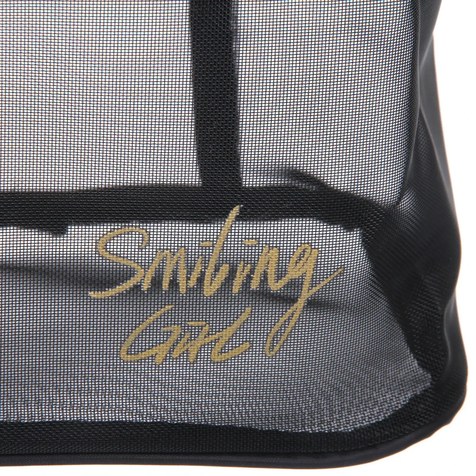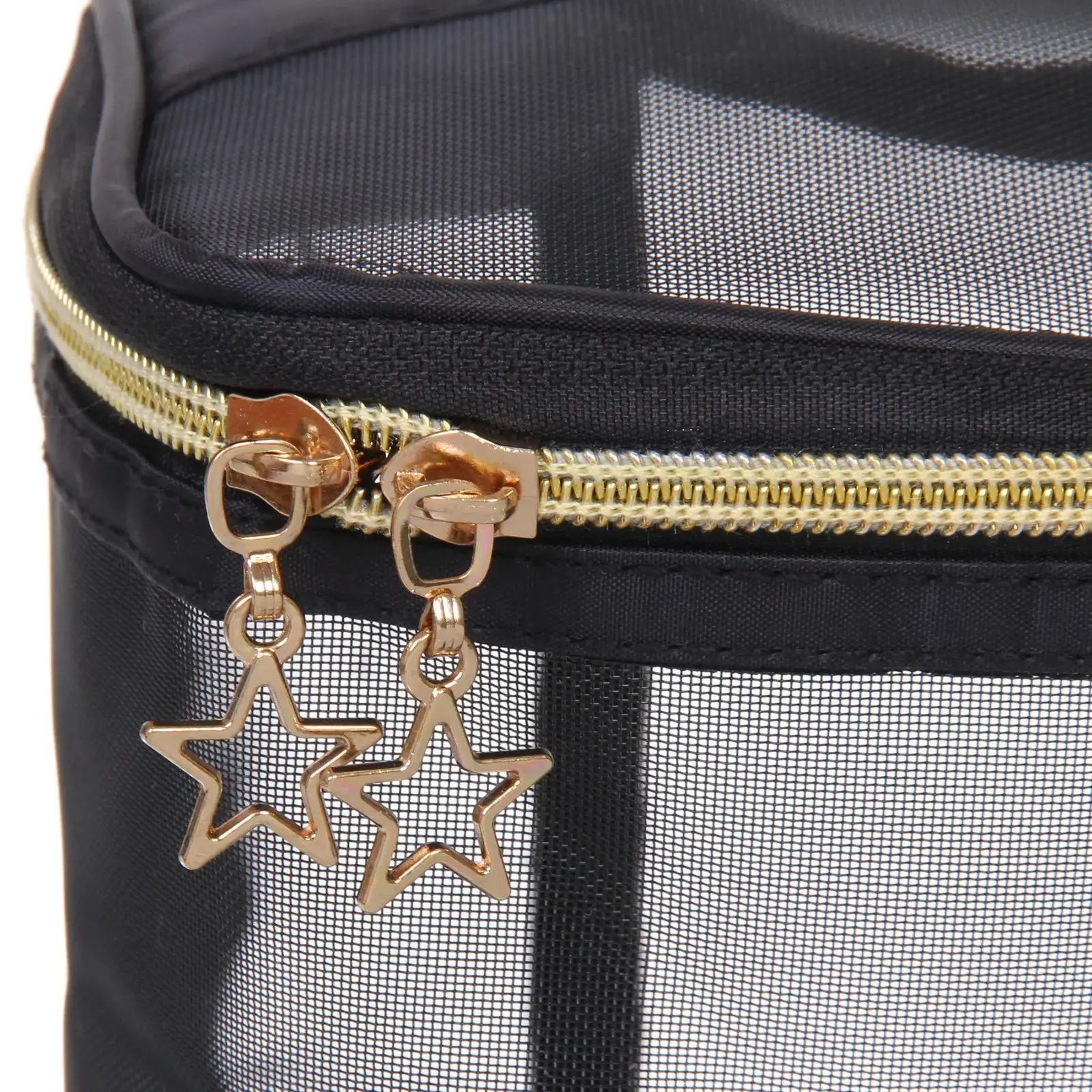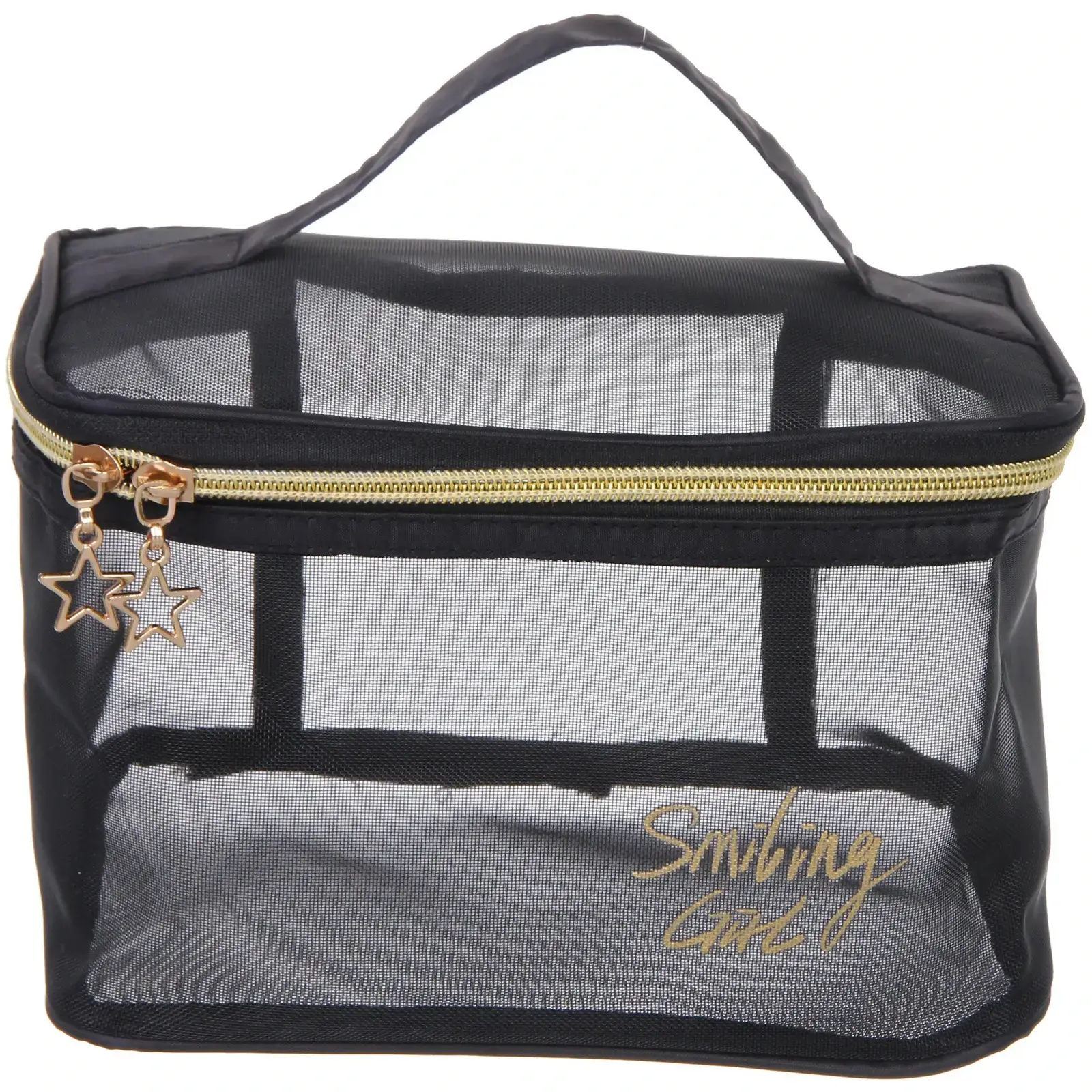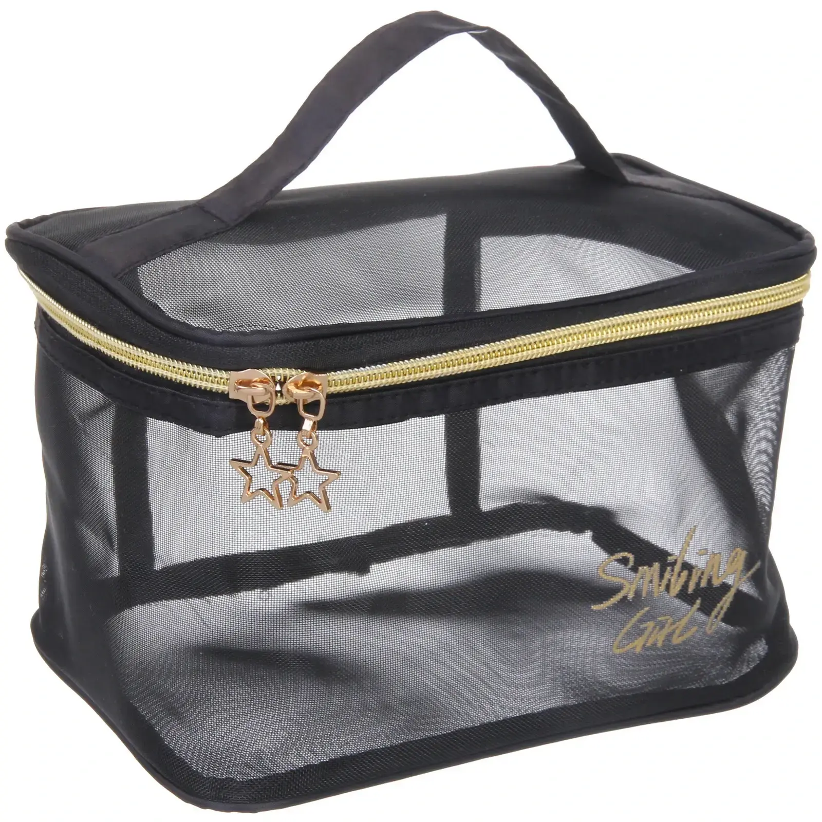 Косметичка выполнена в стильном черном цвете и имеет прямоугольную форму с закругленными углами. Она оснащена удобной ручкой для переноски, что делает её идеальной для поездок и путешествий. Прозрачная сетчатая структура позволяет видеть содержимое, что облегчает поиск нужных предметов. Застежка на молнии с золотистой фурнитурой добавляет изысканности и стиля.