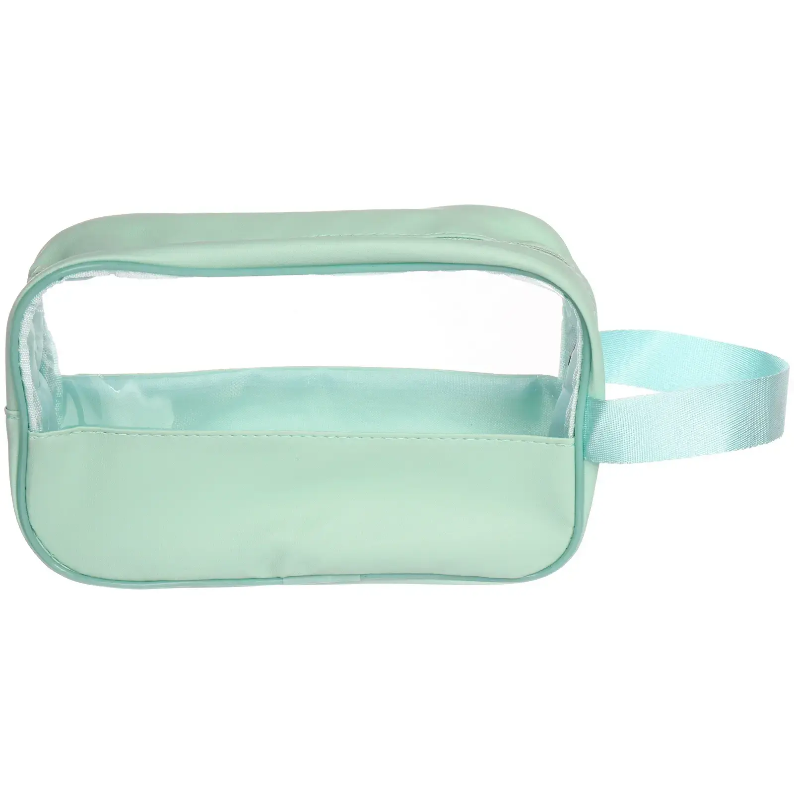 Косметичка выполнена из прочного ПВХ и непрозрачного синтетического материала, что делает её устойчивой к влаге. Прозрачная вставка на лицевой стороне позволяет видеть содержимое, не открывая молнию — удобно в дороге или при быстром поиске нужного предмета. Сбоку расположена прочная ручка для комфортного переноса.