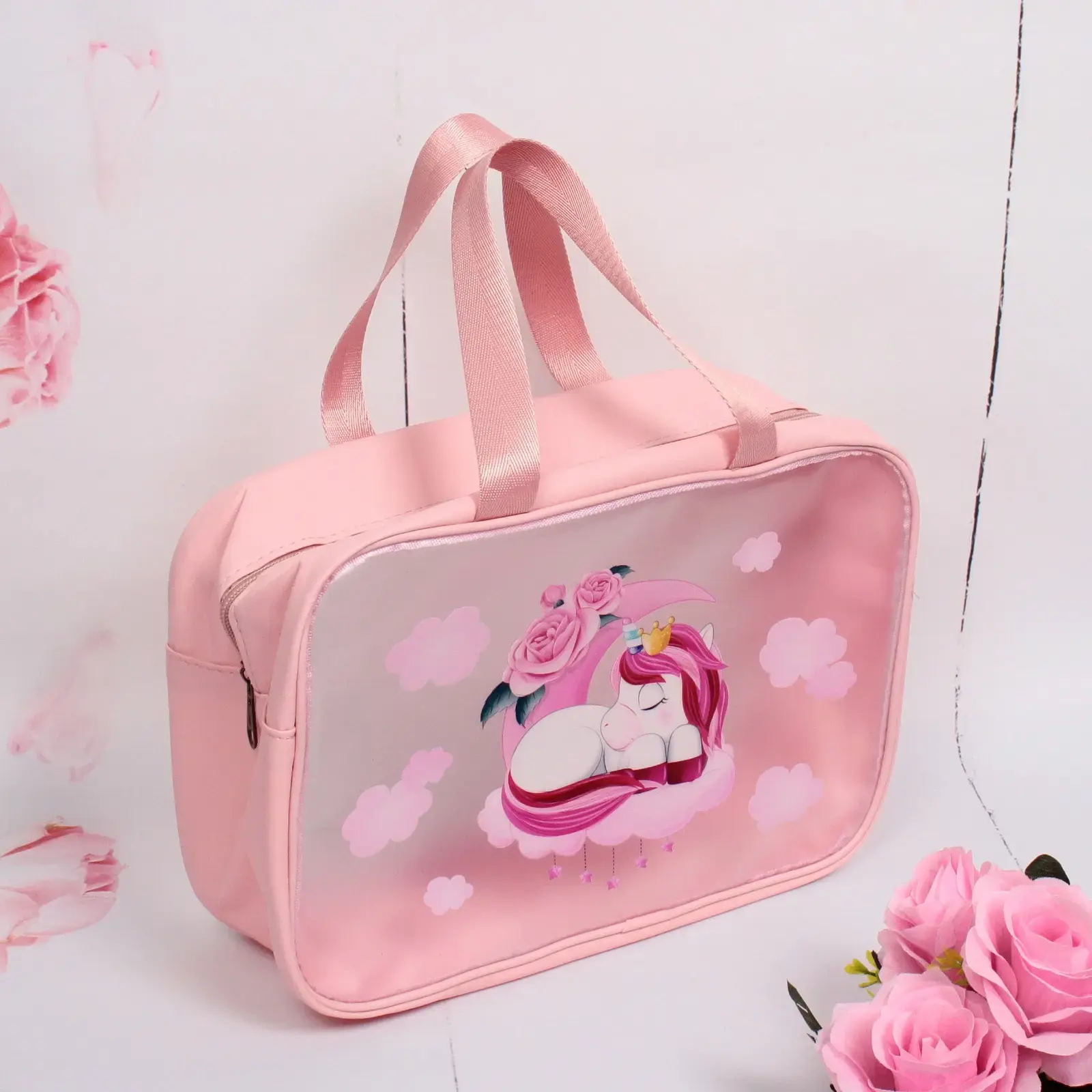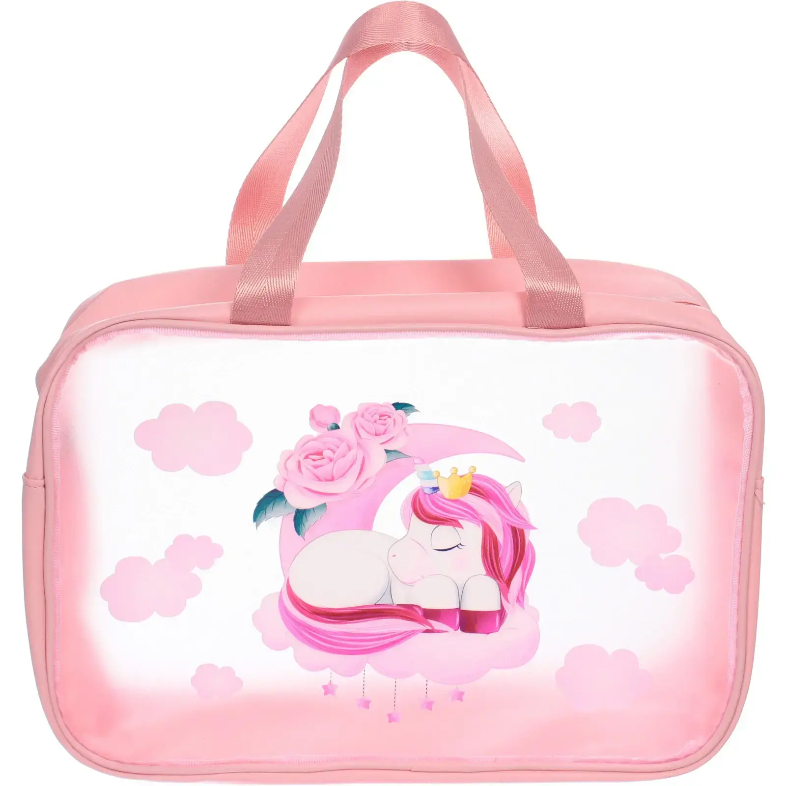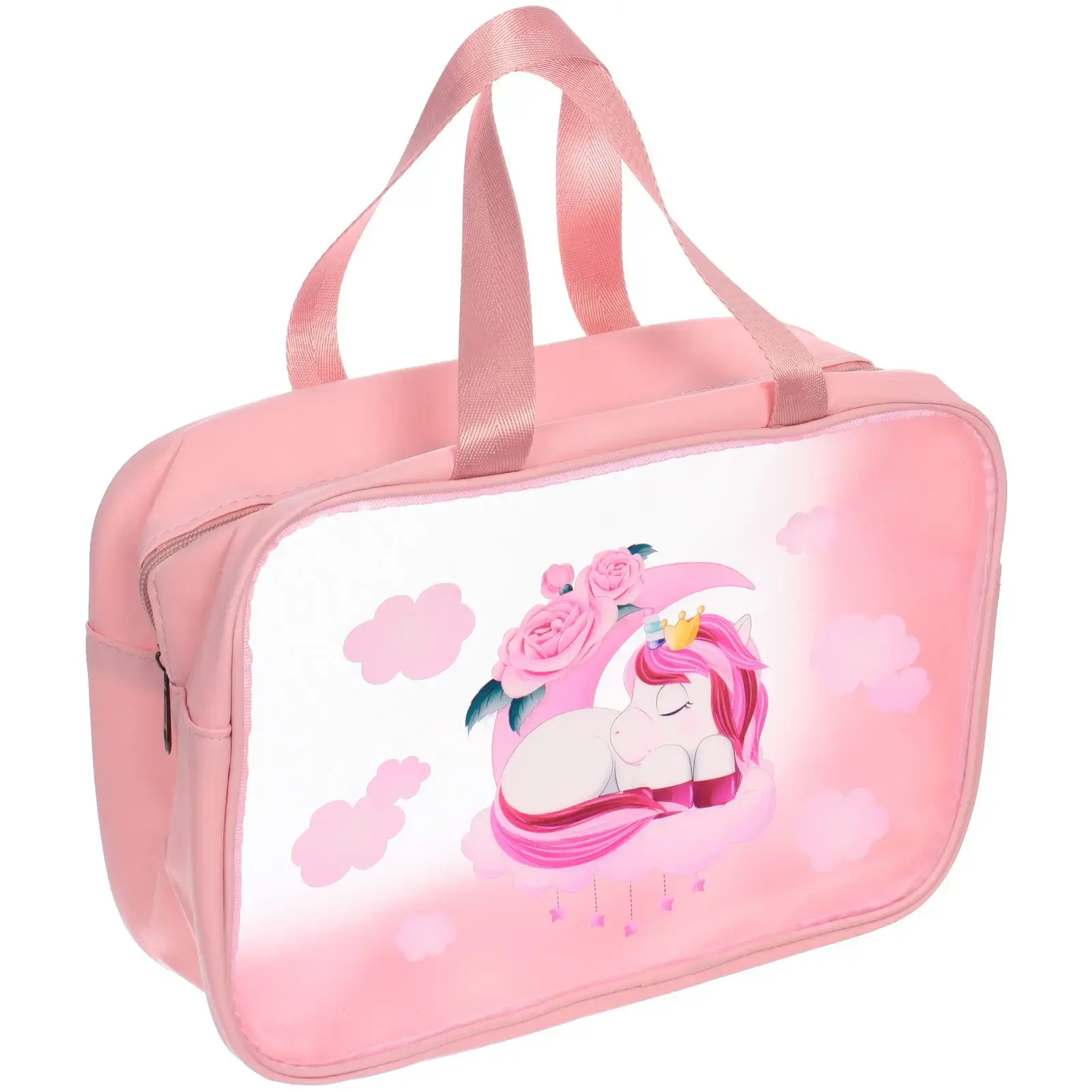 Эта косметичка не только удобна, но и станет ярким акцентом в вашем образе. Выполненная в нежном розовом цвете с изображением милого единорога, она добавит нотку волшебства в повседневные заботы. Размер 21х31х12 см позволяет разместить все необходимые косметические средства и аксессуары, а прочный ПВХ-материал обеспечивает долговечность и легкость в уходе.