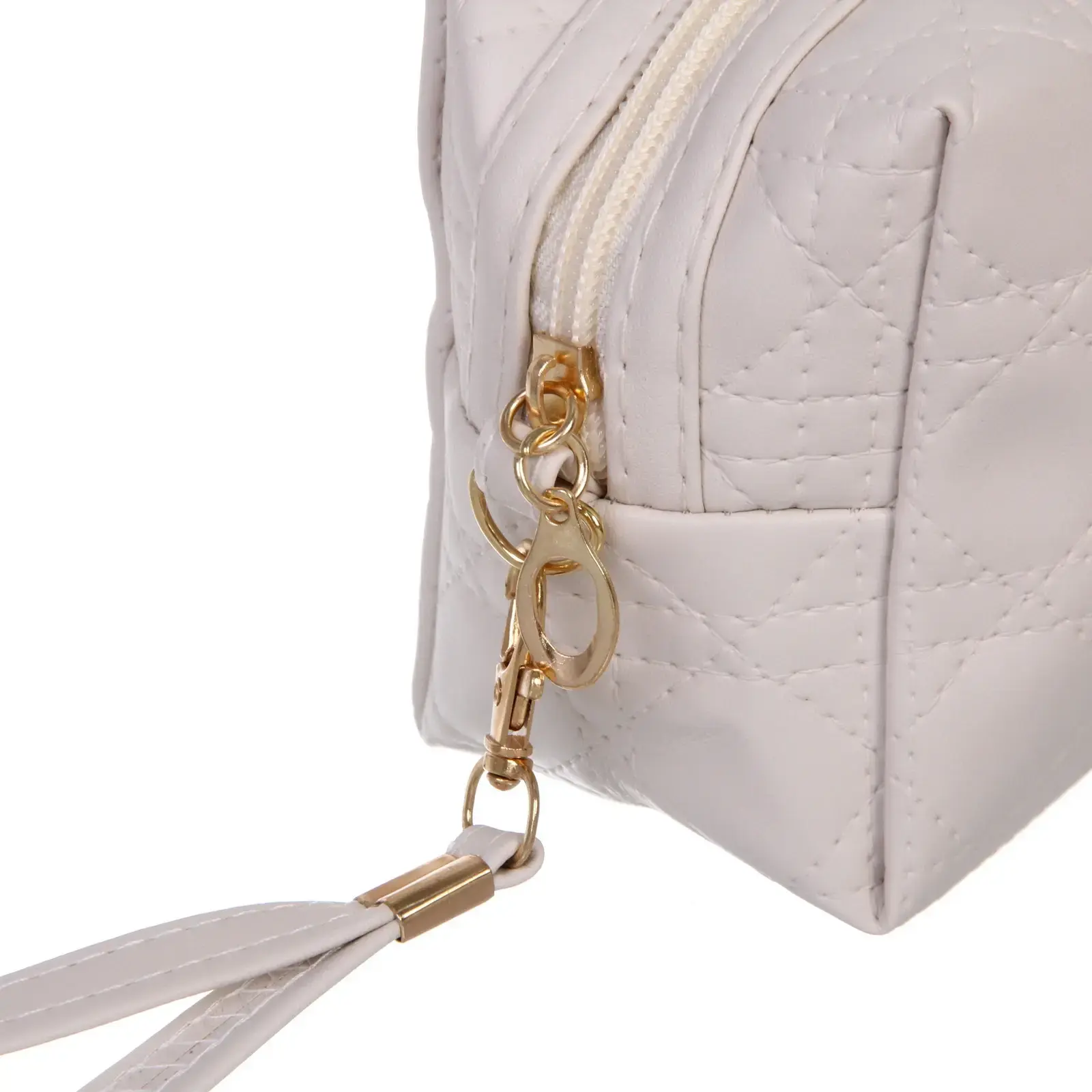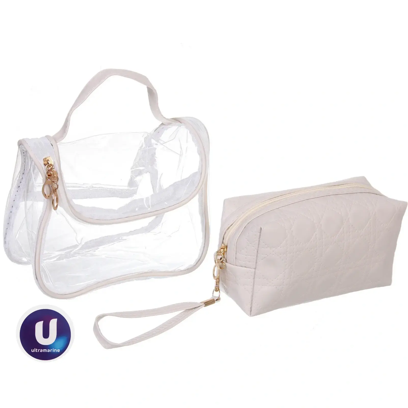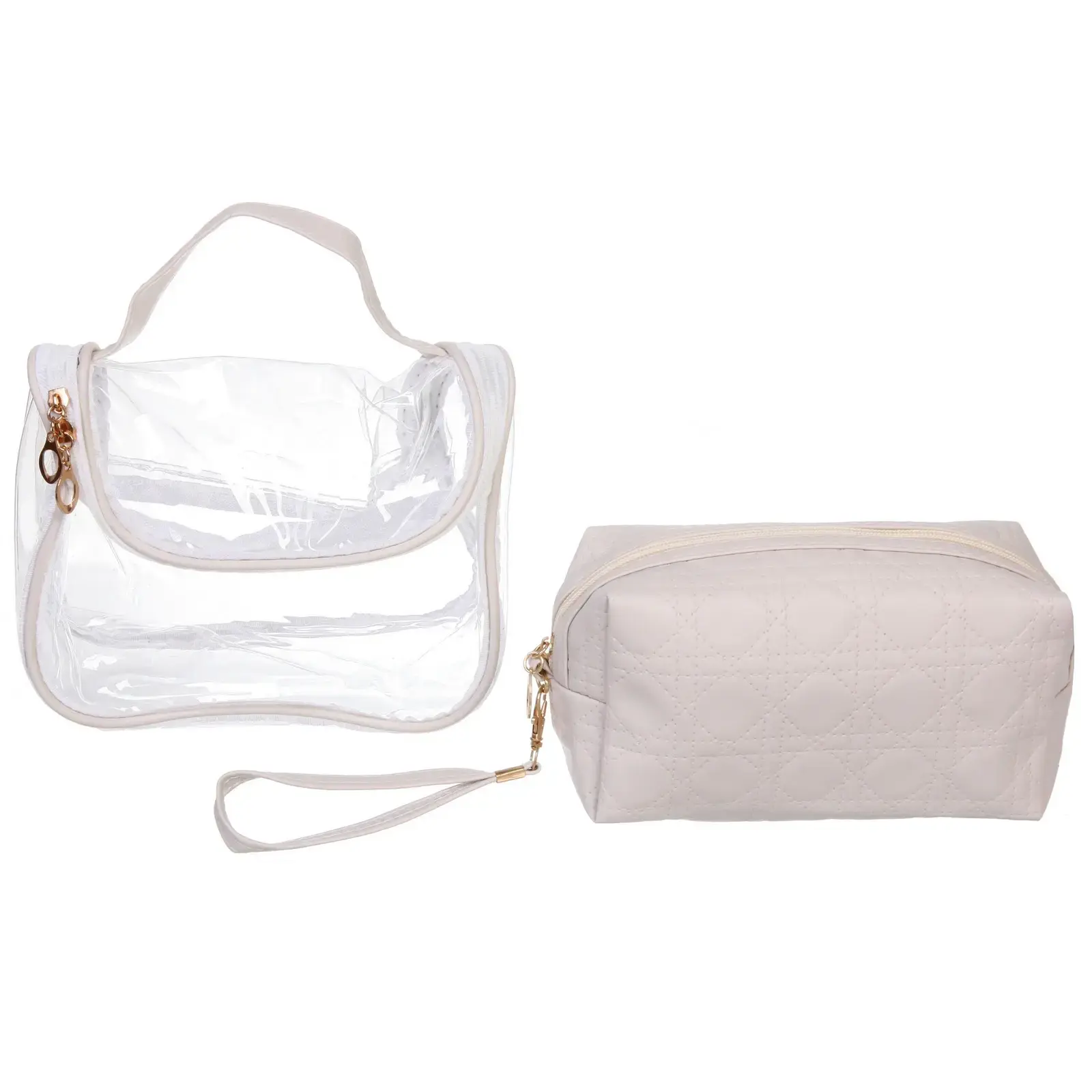 Косметички выполнены из качественных материалов: ПВХ и текстиля, что обеспечивает долговечность и легкость в уходе. Прозрачная косметичка позволяет быстро находить нужные вещи, а непрозрачная с текстурой стеганого узора защищает содержимое от внешних воздействий. Обе косметички имеют удобные ручки и застежки с золотистой фурнитурой, что делает их использование еще более комфортным.