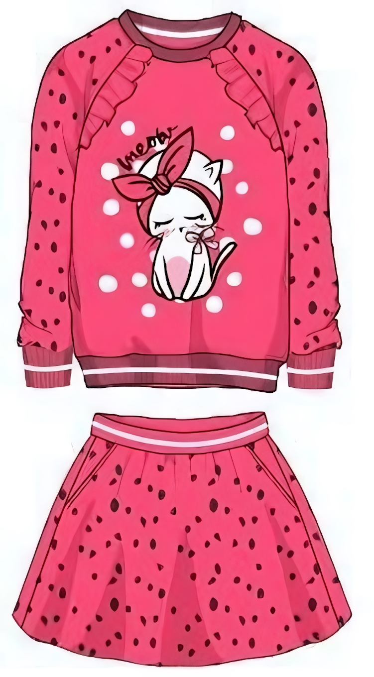 Костюм включает удобную футболку с длинным рукавом и плиссированную юбку. Он отлично подойдет для повседневного использования в детском саду, школе или на прогулках. Яркие принты и интересные детали делают его любимым элементом гардероба девочки.