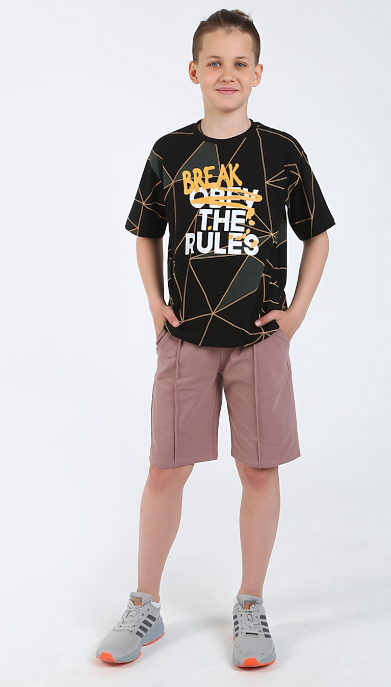 Этот летний костюм сочетает в себе комфорт, стиль и практичность, что делает его отличным выбором для активных мальчиков. Футболка свободного кроя oversize выполнена из мягкой набивной кулирки, имеет короткий втачной рукав и спущенную линию плеча, что обеспечивает свободу движений и современный внешний вид. Принт на полочке придает образу индивидуальность, позволяя выделиться среди сверстников.