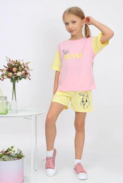 Комплект состоит из футболки oversize с круглым вырезом и спущенной линией плеч, а также шорт желтого цвета с удобным эластичным поясом и карманами. На футболке расположен забавный принт с надписью "BUNNY", а шорты украшены изображением забавного зайца. Цветовое сочетание розового и желтого подчеркивает летнее настроение и придает образу свежесть.