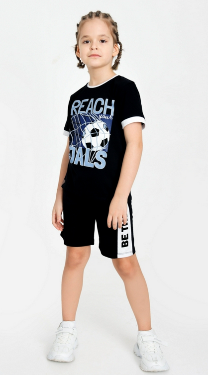 В комплект входит прямая футболка с коротким рукавом и аккуратной узкой бейкой по горловине, а также свободные шорты с длиной выше колена. Футболка украшена стильным графическим принтом в спортивной тематике, а шорты дополнены белыми боковыми вставками с контрастной надписью. По талии – удобная эластичная резинка, которая надёжно фиксирует шорты без стеснения движений.