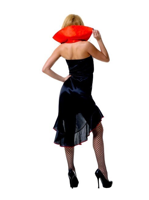 Костюм выполнен в черном цвете с красными элементами, что создает эффектный контраст. Он имеет открытые плечи и обтягивающий силуэт, что подчеркивает фигуру. Асимметричный подол добавляет динамики и оригинальности. Этот наряд станет отличным выбором для тех, кто хочет выглядеть стильно и привлекательно.