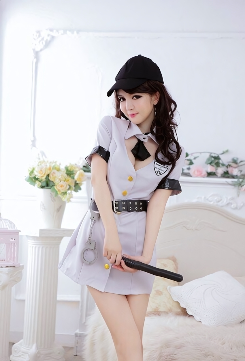 Изготовленный из качественного полиэстера, костюм обеспечивает комфорт и долговечность. Серый цвет с черными лацканами и декоративными золотыми пуговицами придает ему элегантный вид. Платье приталенного кроя длиной до середины бедра подчеркивает фигуру, а черный широкий ремень с металлическими люверсами добавляет акцент на талии. Пластиковые наручники и дубинка, прикрепленные к ремню, делают образ завершенным и добавляют элемент игры.