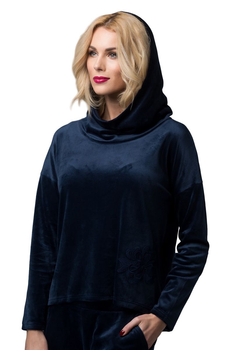 Костюм женский домашний бархатный, топ с капюшоном и брюки, размер S, темно-синий