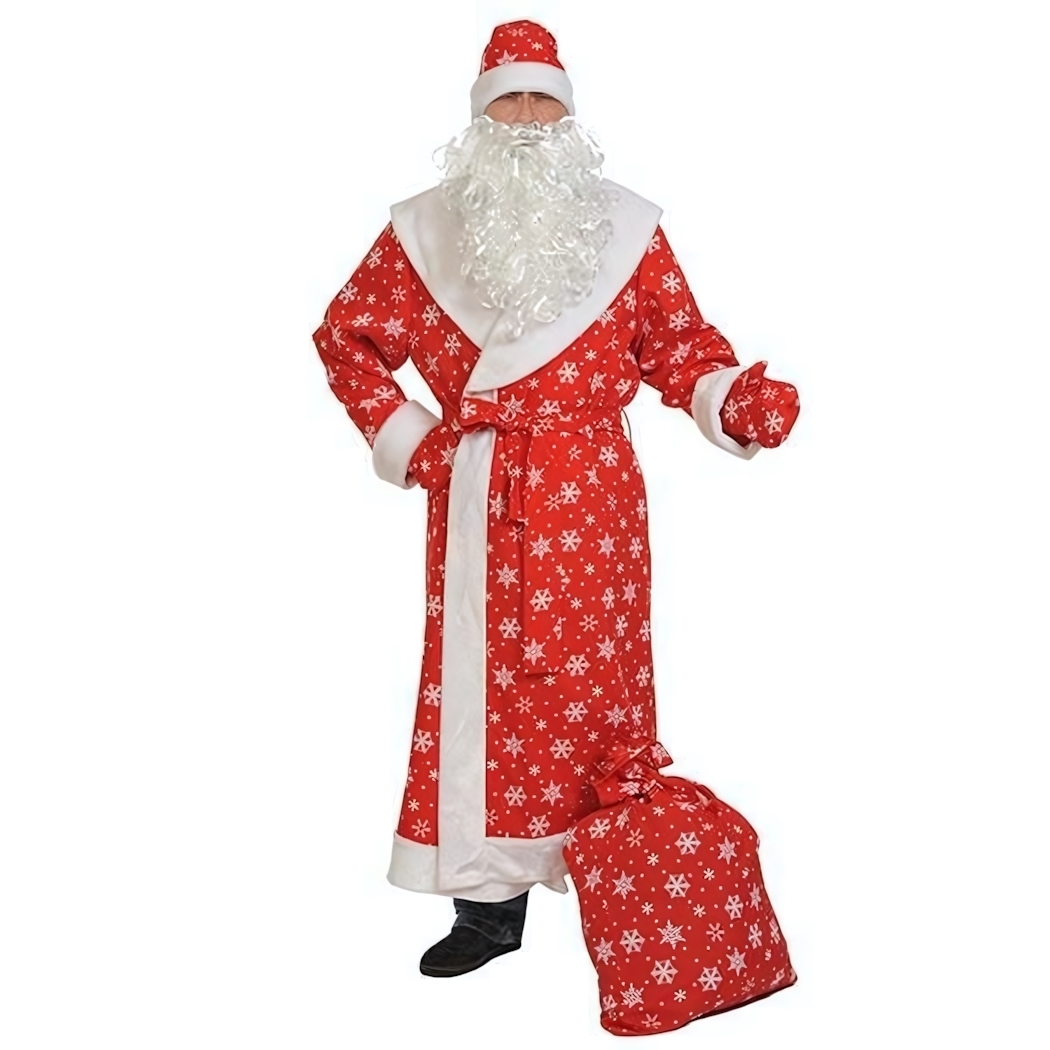 Костюм включает в себя халат, шапку, варежки, бороду, пояс и мешок, что позволяет вам полностью вжиться в образ Деда Мороза. Он подходит для мужчин с размером 56-58, что делает его универсальным для большинства мужчин. Легко надевается и снимается, что позволяет быстро подготовиться к празднику.