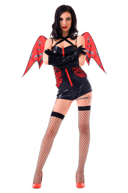 Выбирая этот костюм, вы получаете не только стильный наряд, но и возможность выделиться из толпы. Обтягивающий крой и глянцевый материал делают его идеальным выбором для тех, кто хочет произвести впечатление. Красные крылья с черным контуром и рисунком в виде летучих мышей добавляют образу загадочности и игривости.