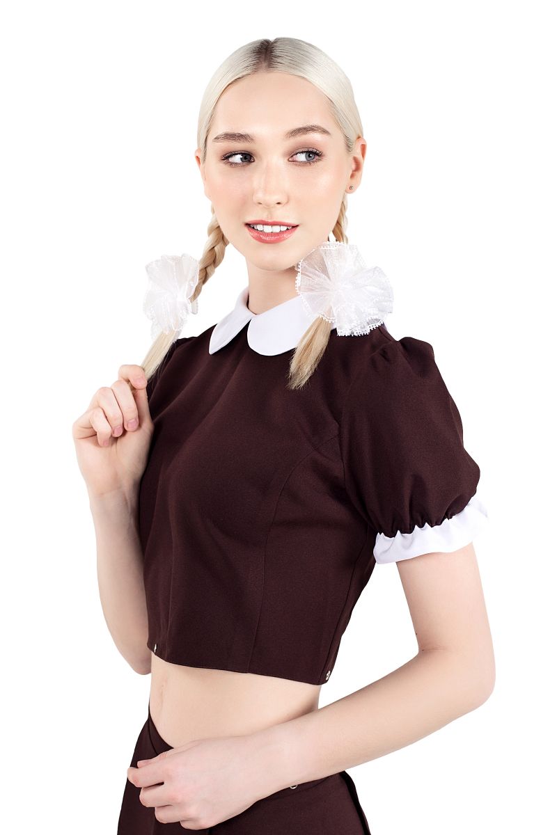 Верх костюма «русская школьница» создан для тех, кто хочет добавить в отношения страсть, игривость и яркие эмоции. Укороченный коричневый топ эффектно подчеркивает фигуру, открывает линию талии и создает притягательный силуэт. Открытая спина с треугольным вырезом добавляет образу дерзости и делает каждый поворот особенно впечатляющим.