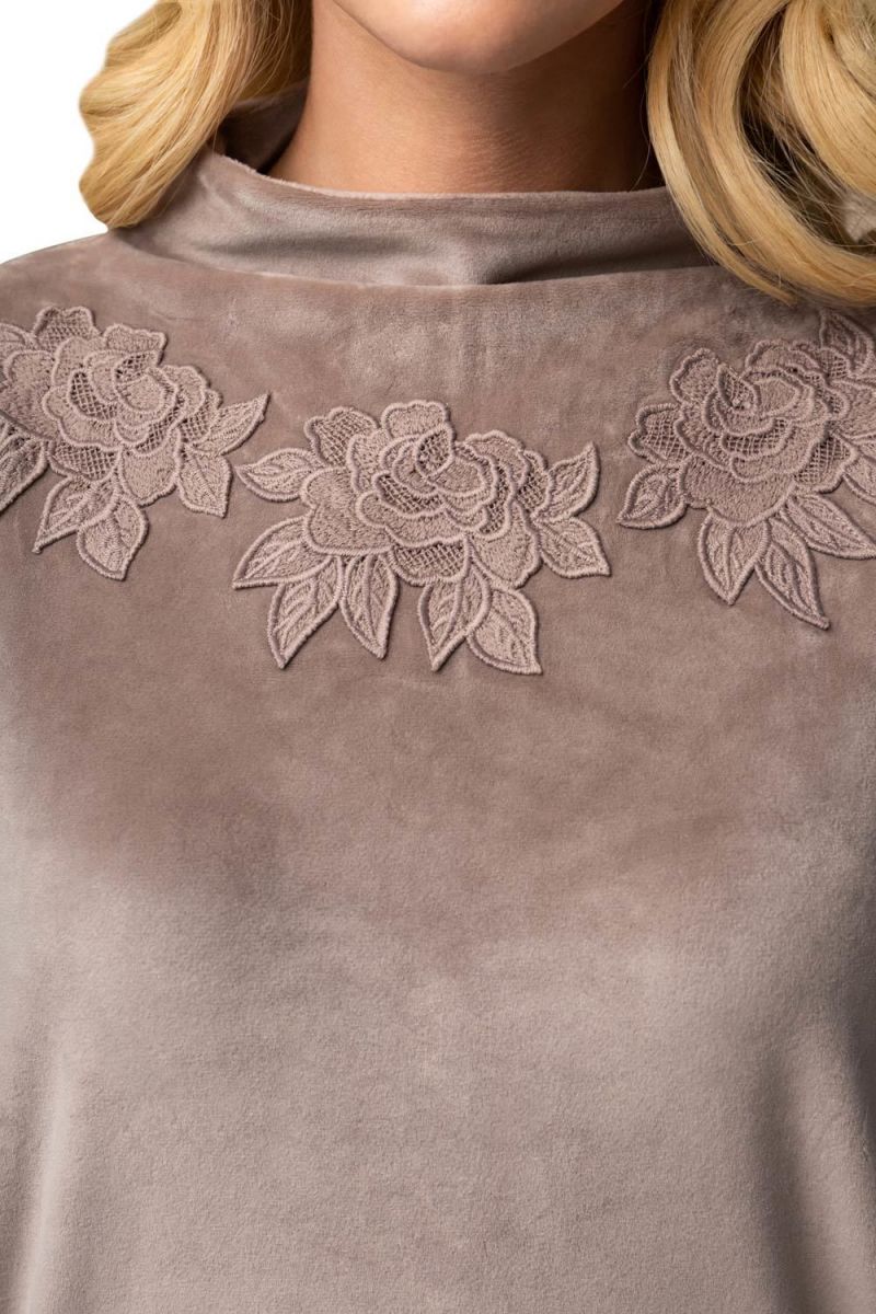 - Свитшот: Полуприлегающего кроя с модными рукавами-«летучая мышь», которые обеспечивают полную свободу движений. Мягкая стойка-воротник застёгивается на молнию на спинке, создавая аккуратный силуэт. Изюминка модели — нежная аппликация из кружевных цветов на груди, добавляющая образу женственности и изысканности.